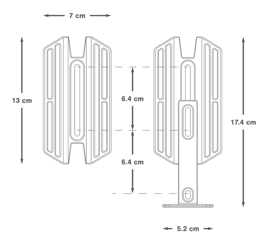 Der Gepäckträger verfügt über eine 2-Schrauben-Montageplatte, ergänzt durch einen optionalen Fuß, der verwendet werden kann, um den Käfig so zu erweitern, dass er auf Gabeln mit 3-fach Gewinde passt und in beiden Konfigurationen zusätzliche Tragfähigkeit bietet.