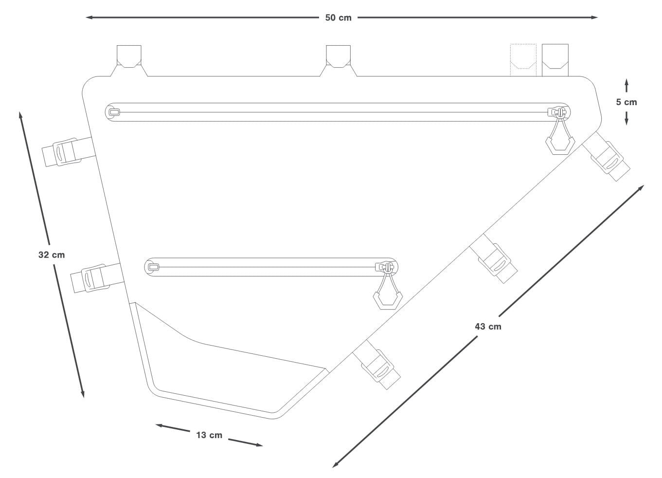 Es gibt gute Gründe dafür, dass das Full Frame Pack die erste Tasche sein sollte, die als potenzieller Stauraum in Betracht gezogen wird. Denn es gibt keine effektivere Möglichkeit, den Schwerpunkt deines Fahrrads gleichzeitig tief und auf einer schmalen Mittelebene zu halten. Das Hauptdreieck eines Fahrradrahmens ist ein großer Raumbereich, den das Full Frame Pack effizient nutzt und so die seltene Kombination einer großvolumigen Aufbewahrungsmöglichkeit mit geringen Auswirkungen auf das Fahrradhandling schafft.