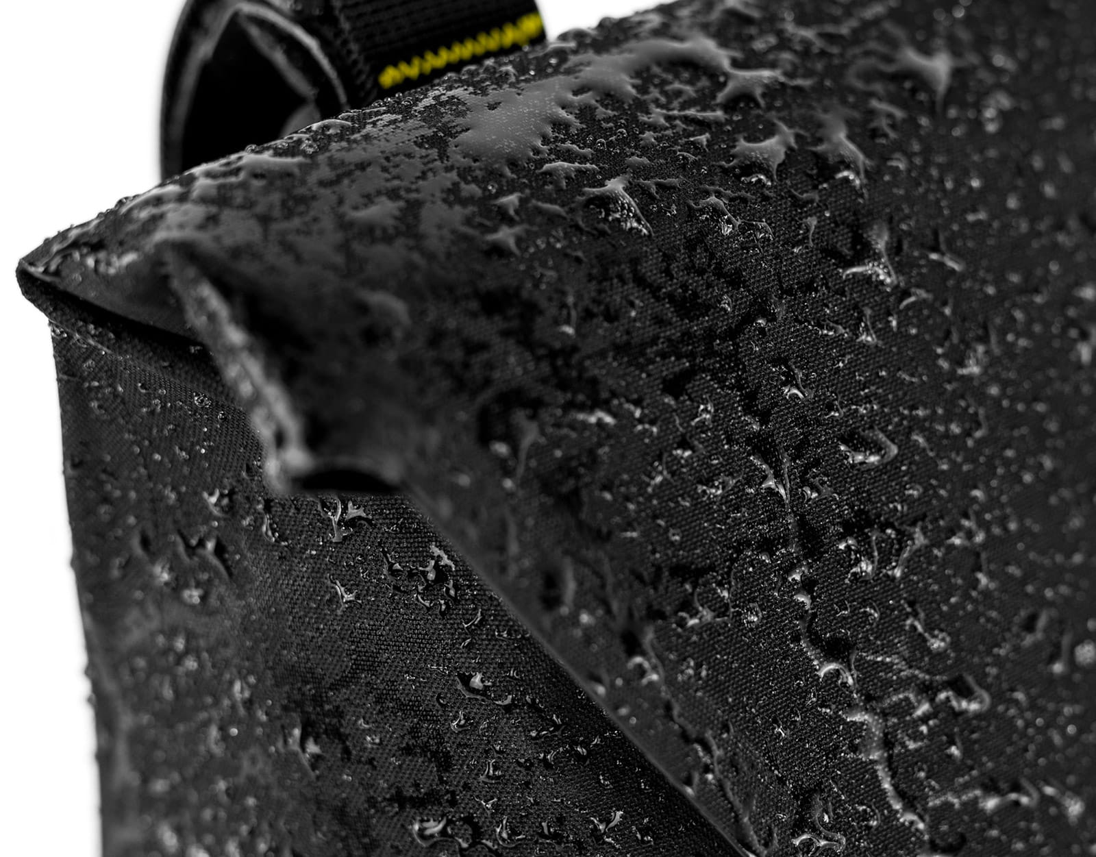 Die Lenkertasche besteht aus Hexalon, einem maßgeschneiderten laminierten Stoff, der speziell für Apidura entwickelt wurde. Das Material wurde für die Anforderungen von Ultra-Distanz-Wettkämpfen entwickelt. Es ist wasserdicht, leicht und weist eine hohe Reiß- sowie Abriebfestigkeit auf.
