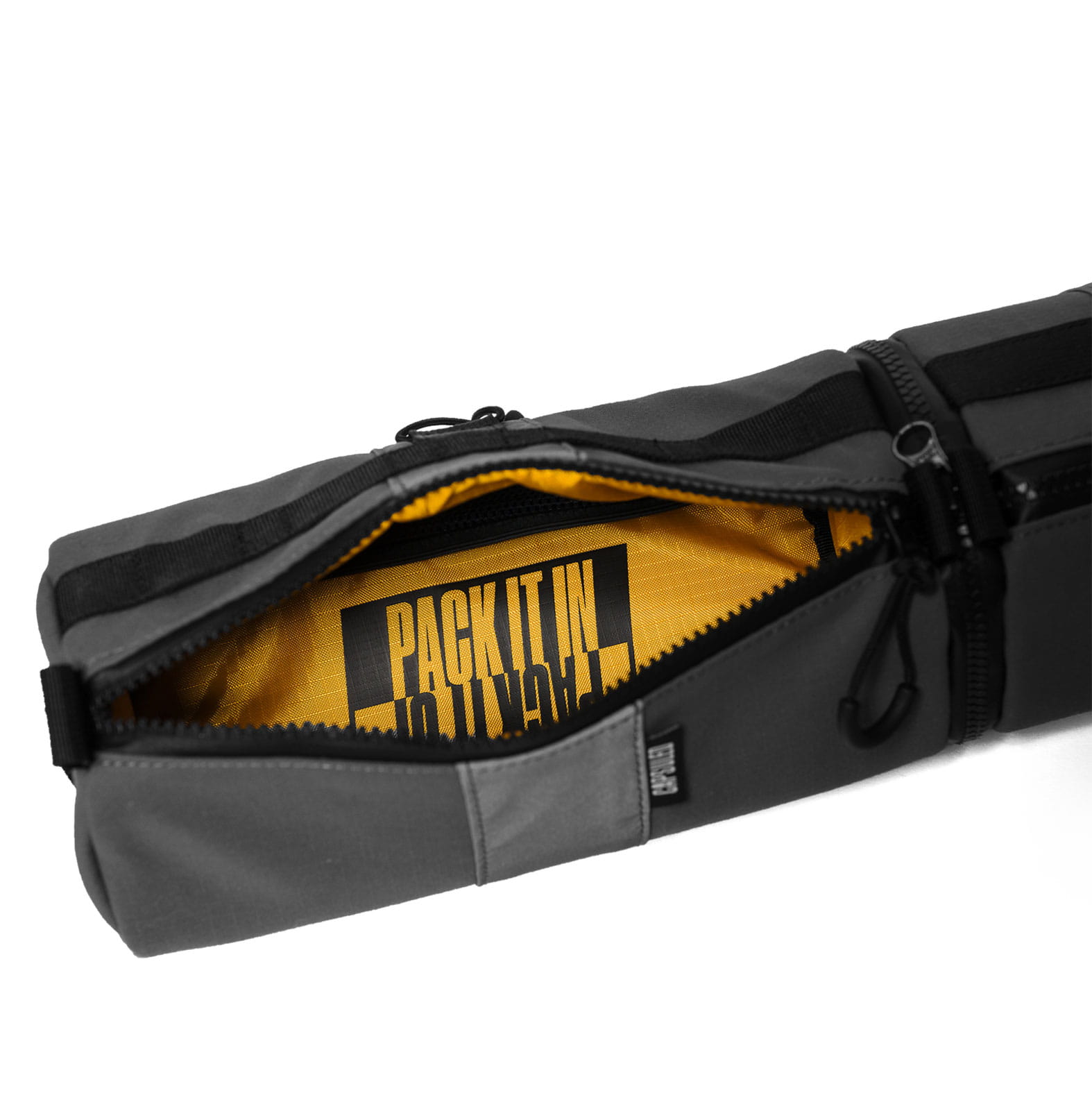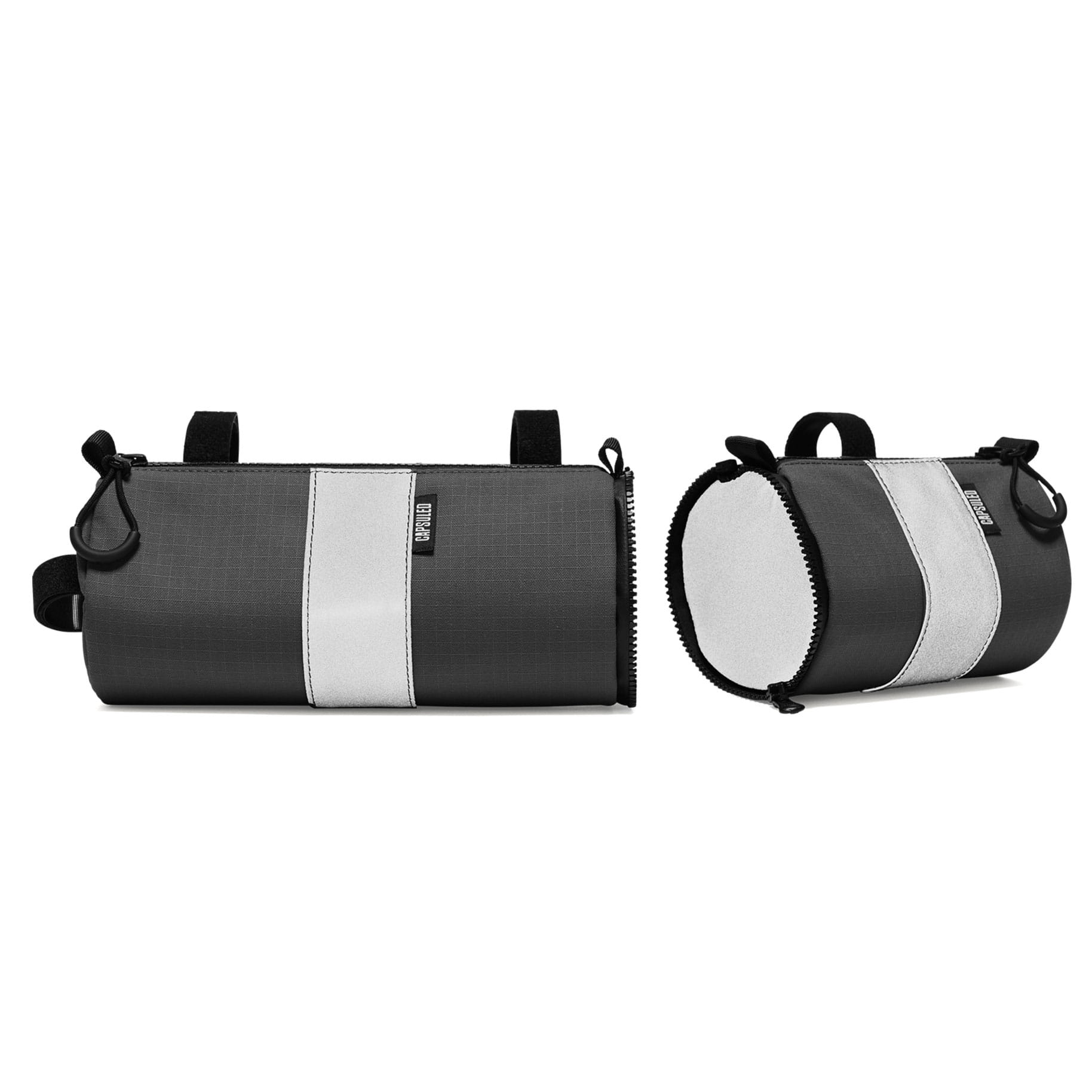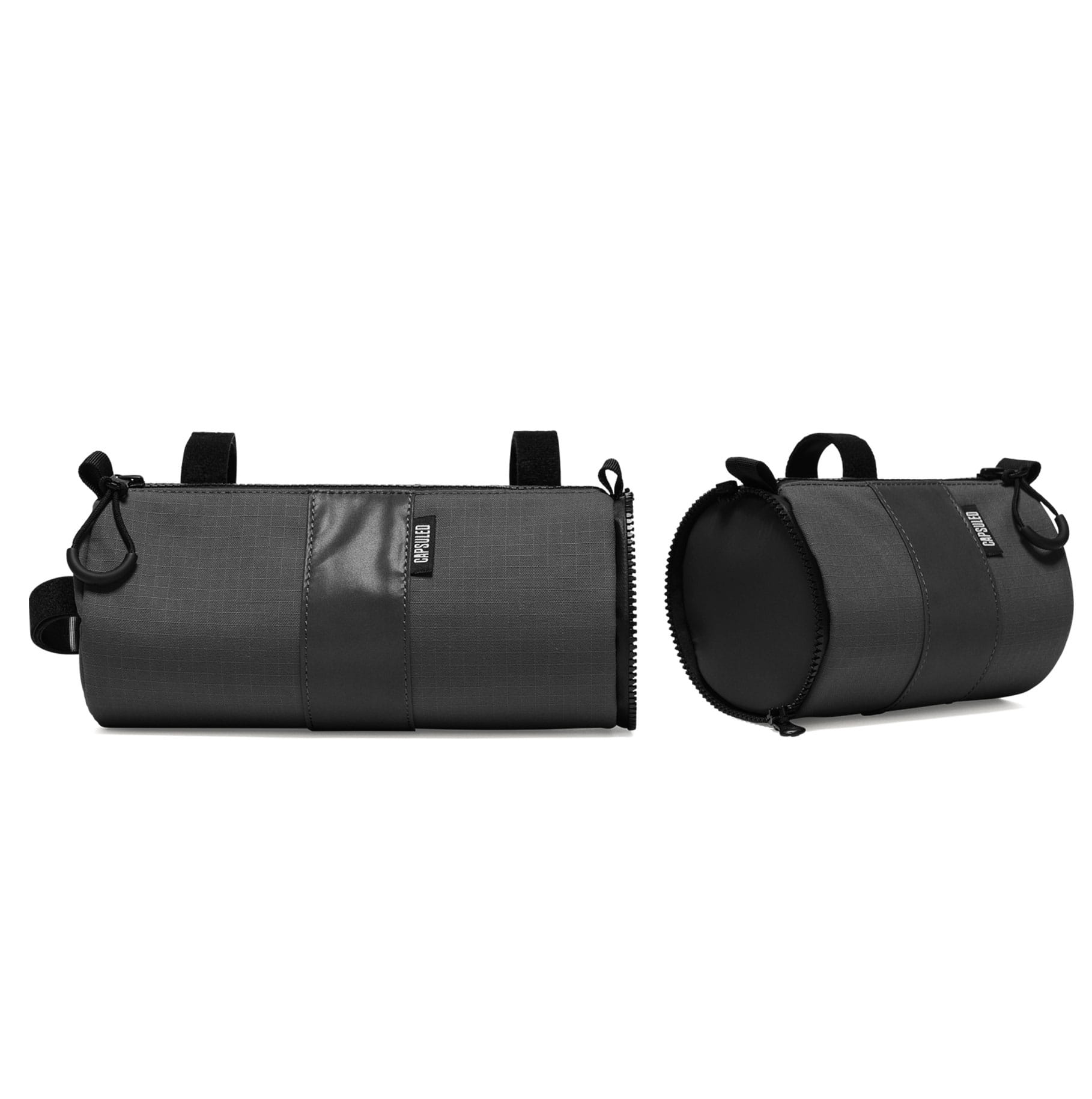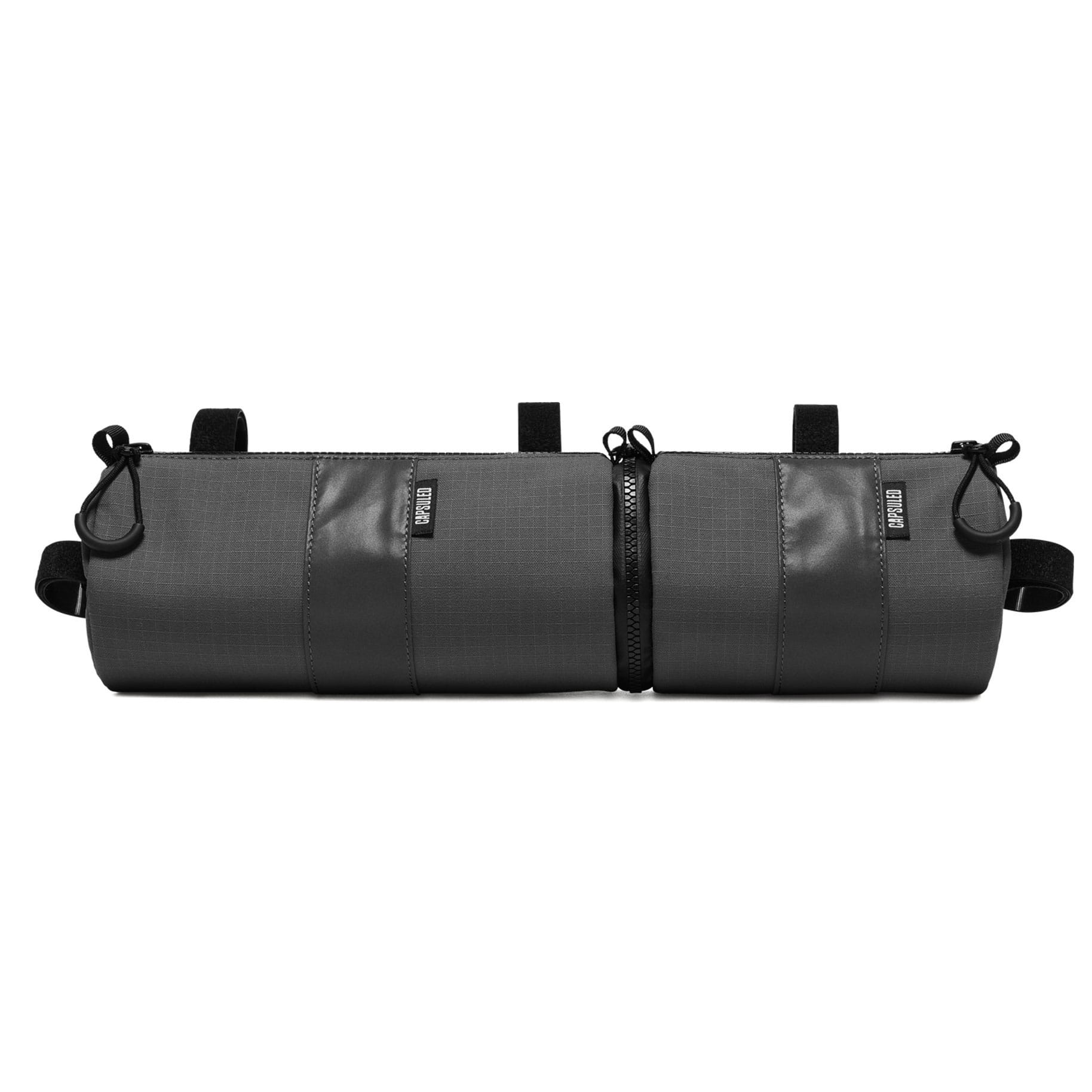- Beide Einheiten können als Rahmentasche am Oberrohr befestigt werden, mit einem Reißverschluss verbunden oder voneinander getrennt werden