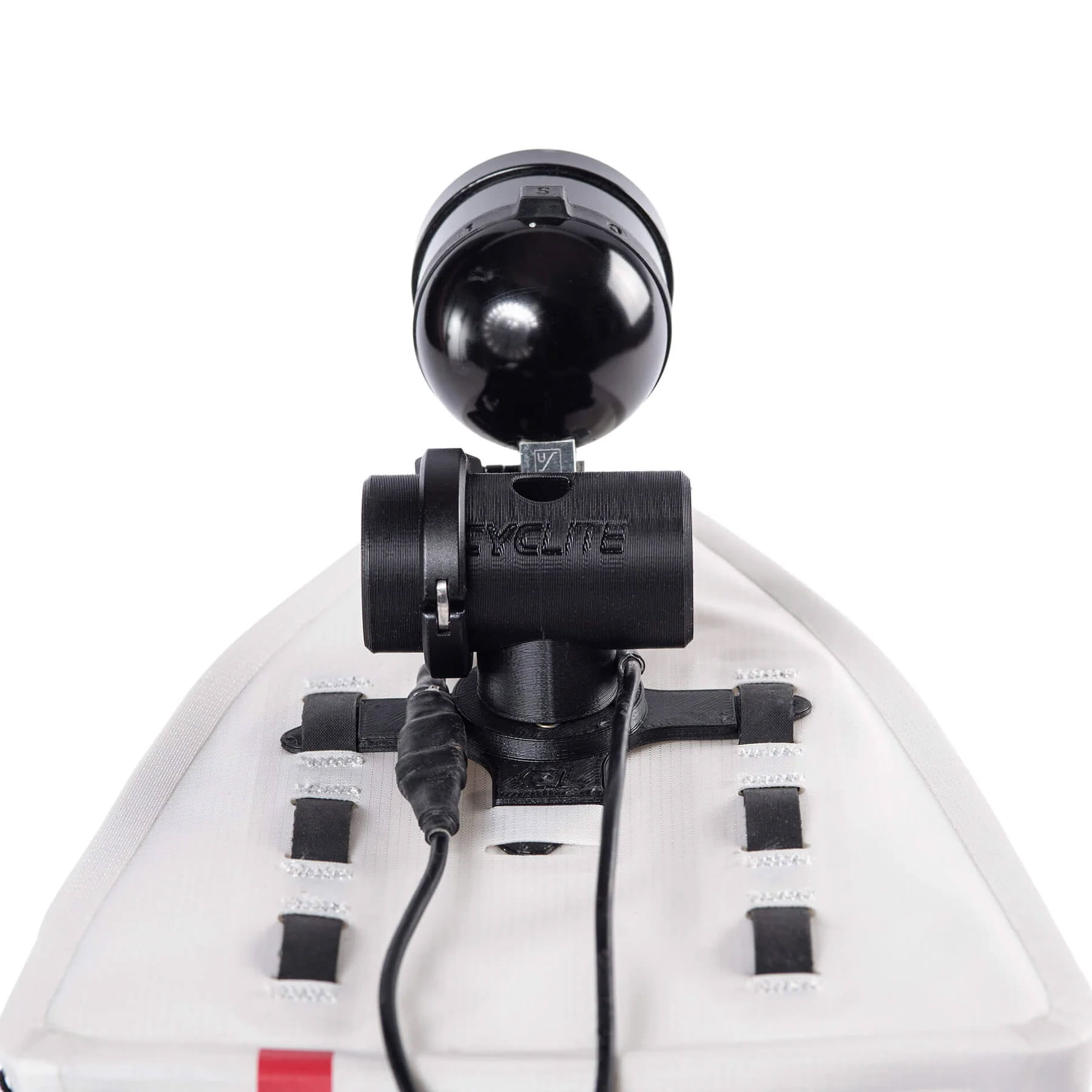 Die Cyclist Aero Mount / 01 Halterung ist eine leichte und praktische Lösung, um Licht- oder GPS-Geräte an der Handle Bar Aero Bag zu befestigen. Die Halterung lässt sich einfach, schnell und stabil an den Laschen auf der Oberseite der Tasche anbringen. Es fungiert als „Lenkerersatz“ und ermöglicht die Befestigung der meisten kompakten Frontlampen oder Fahrradcomputer / GPS-Geräte sowie als Adapter für Smartphone- und GPS-Halterungen. Damit wird die Platzproblematik bei der Nutzung der Handlebar Aero Bar Bag, insbesondere bei Aufliegern, gelöst. Mit einem Gewicht von nur 36 Gramm ist die Aero Mount Halterung ultraleicht.