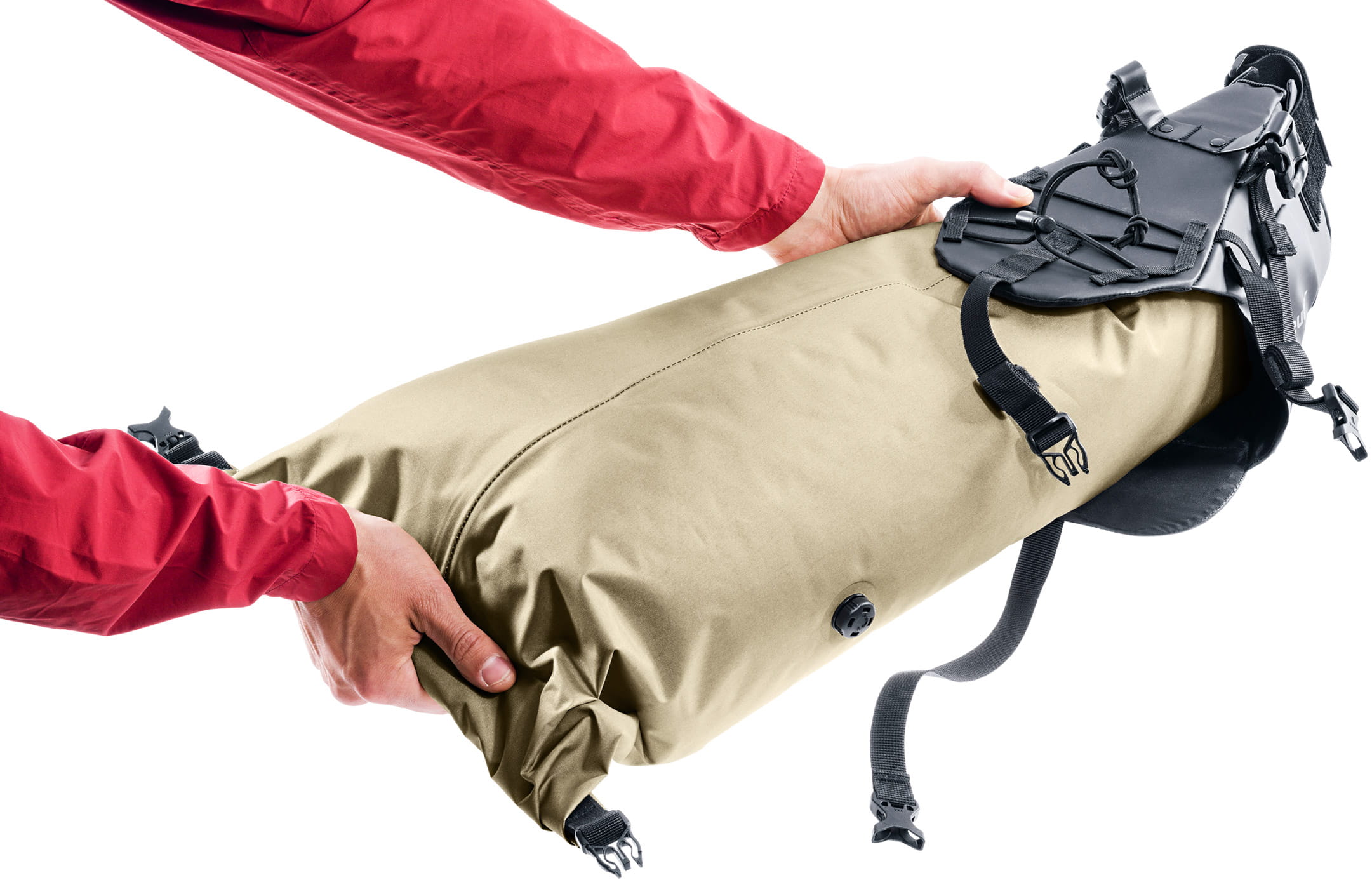 - Packsack mit Rolltop durch Gurtbänder mit Schnallen an Satteltasche seitlich und mittig fixierbar