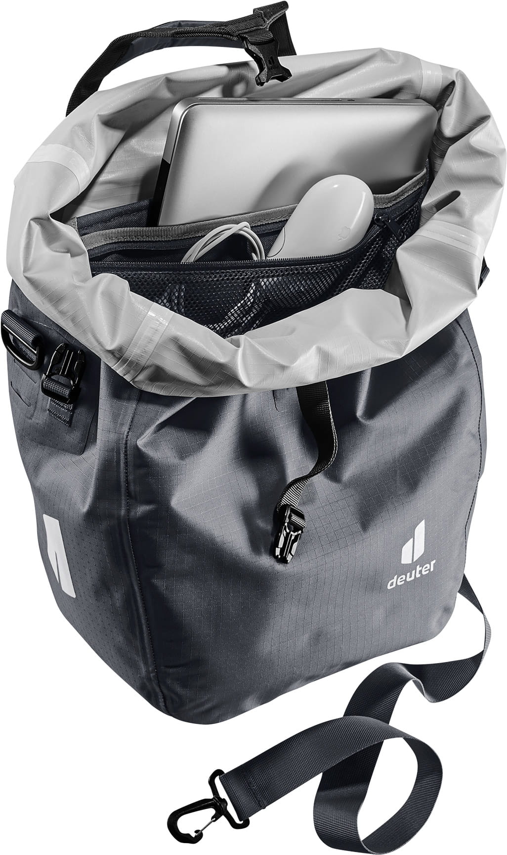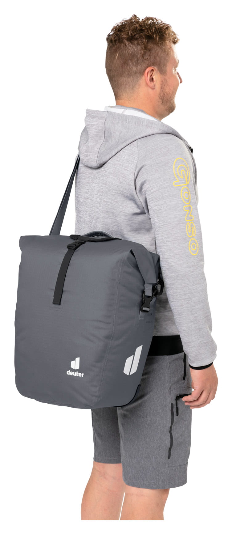 Die wasserdichte deuter Weybridge Gepäckträgertasche bewahrt Reisegepäck sicher vor dem Eindringen der Nässe durch Regen oder Spritzwasser. Dank des 2-Wege-Rolltopverschlusses kann das Volumen um zusätzliche 5 Liter erweitert werden. Die neu entwickelte BagFix-Halterung sorgt für maximale Bewegungsfreiheit, da die Last zu 100% auf dem Hinterrad und nicht auf dem Rücken des Bikers liegt. Die Tasche kann mit nur einem Handgriff vom Gepäckträger abgenommen und als Schultertasche verwendet werden. So sind deinem Einsatz kaum Grenzen gesetzt.