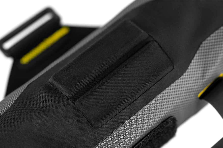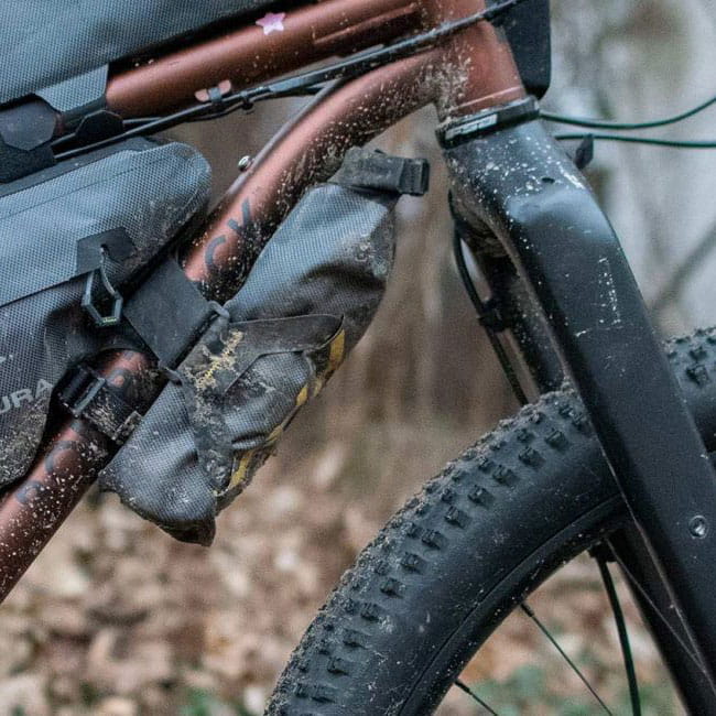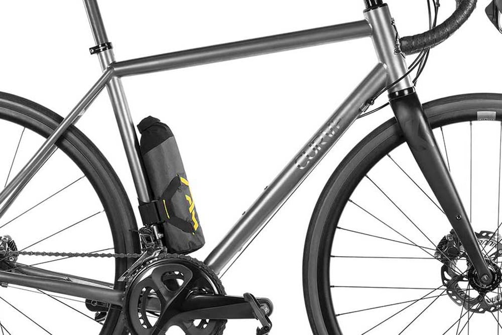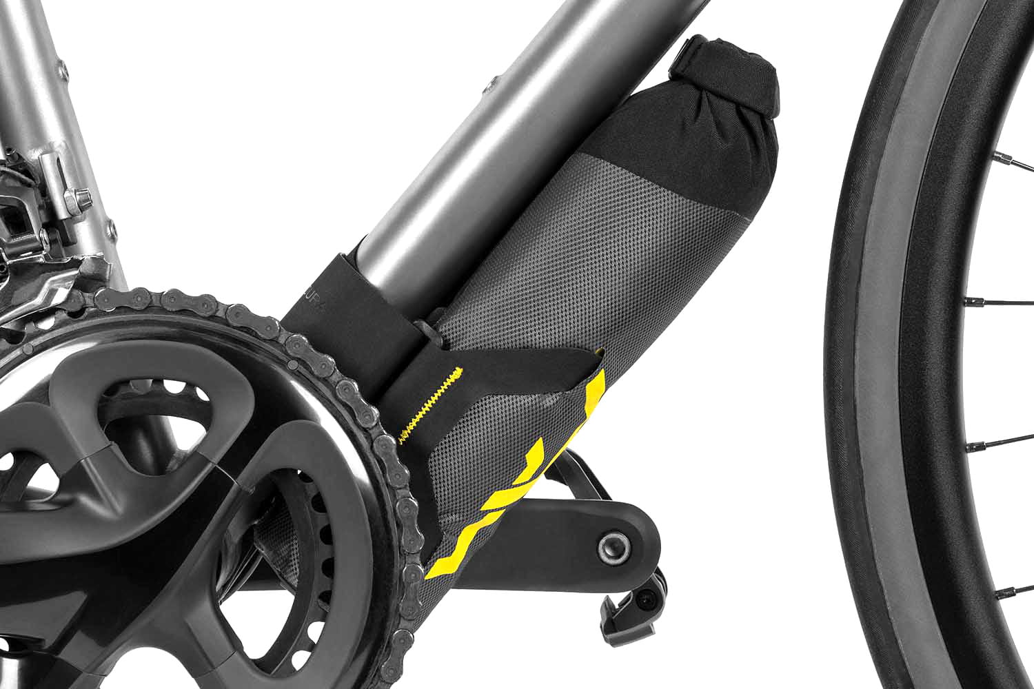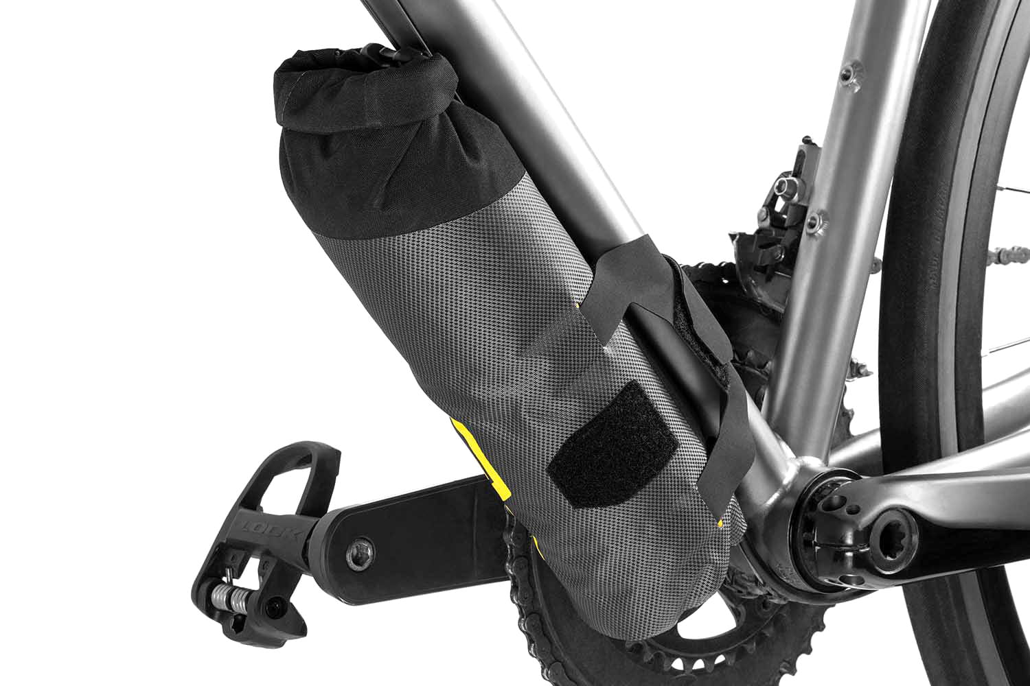 The Apidura Expedition Downtube Pack attaches securely to the downtube as well as similar diameter tubes, providing versatile and compressible storage space for spare parts and long-distance riding essentials. It has enough capacity for a 710ml water bottle and can therefore be used as a bottle holder bag for bikes with limited bottle storage space in the main triangle.
