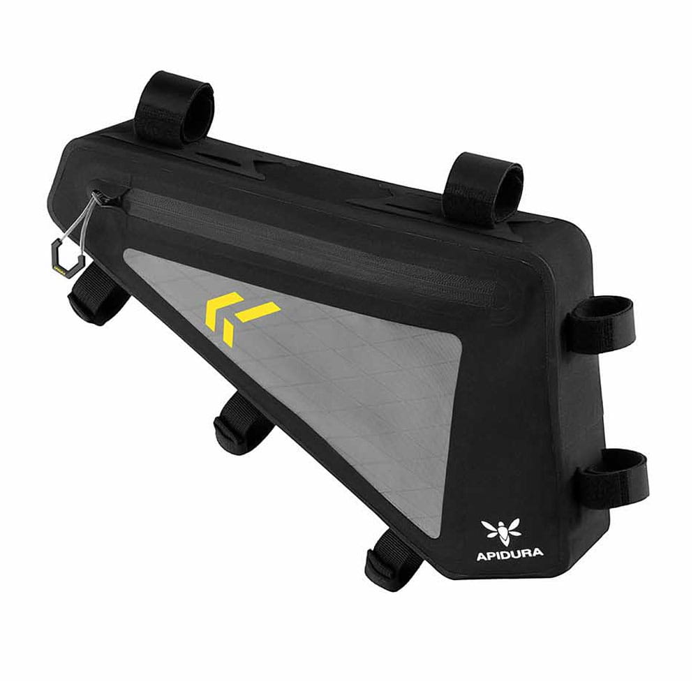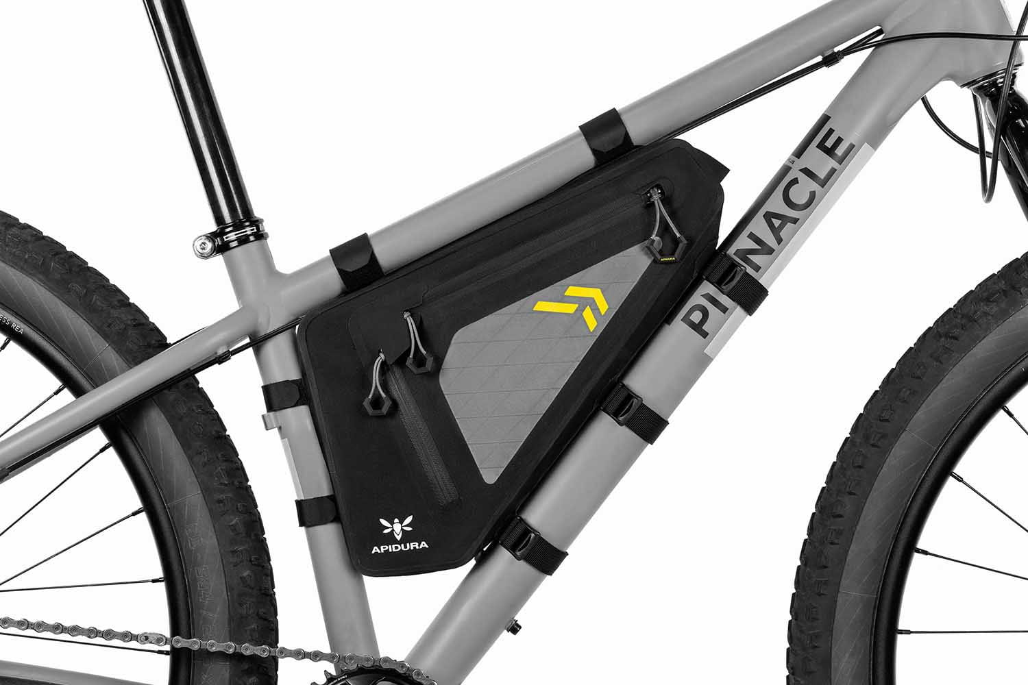With a reinforced structure, the Apidura Backcountry Full Frame Pack is versatile enough to either completely fill the main triangle or leave enough space on the seat tube for a bottle cage. The frame bag features a double zipper opening allowing easy access and full visibility of the contents. At the same time, it remains possible to only open the top zipper for easy access while driving.