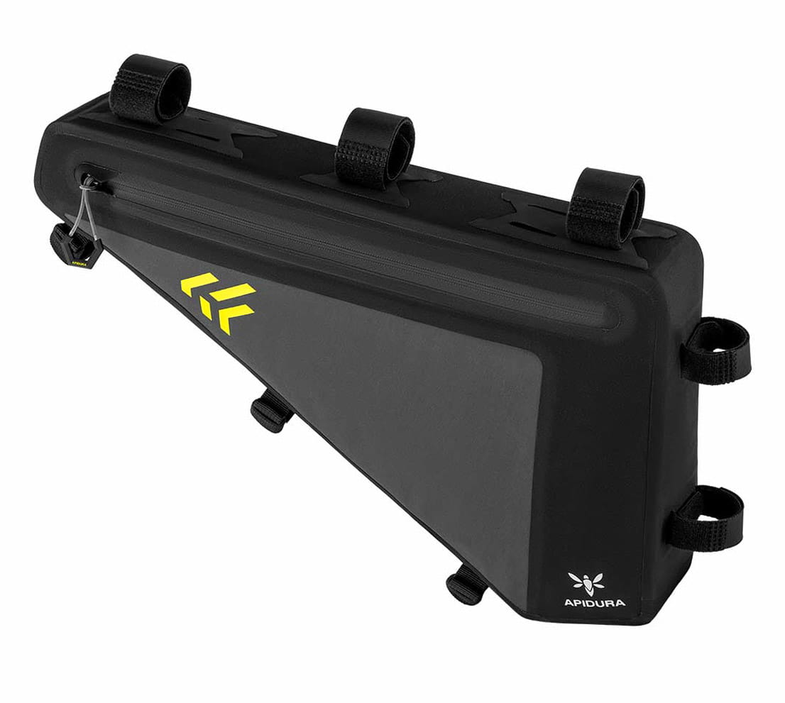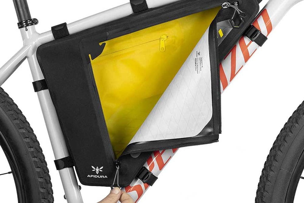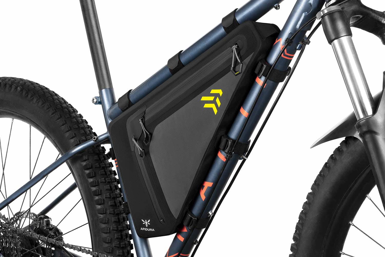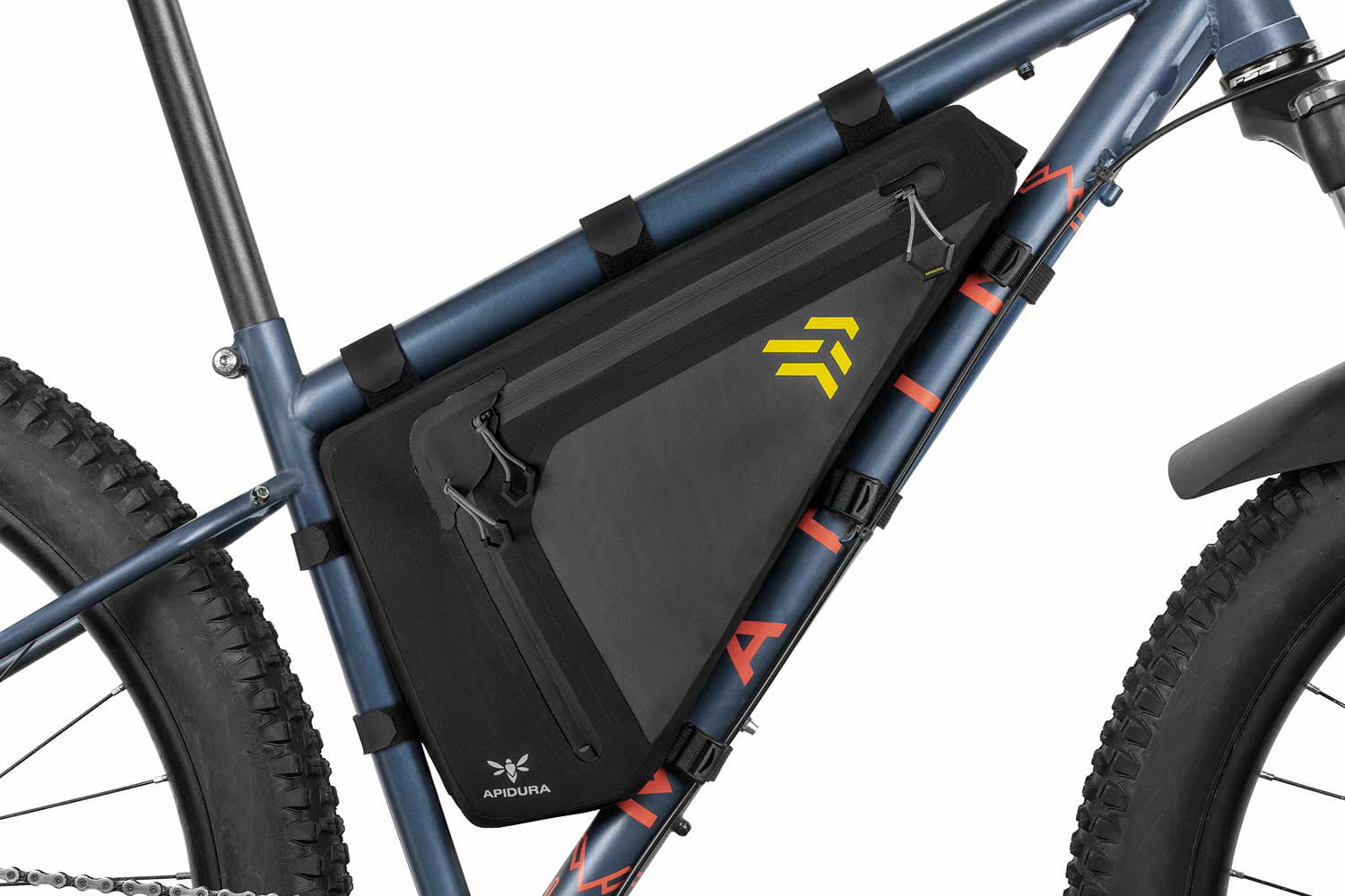With a reinforced structure, the Apidura Backcountry Full Frame Pack is versatile enough to either completely fill the main triangle or leave enough space on the seat tube for a bottle cage. The frame bag features a double zipper opening allowing easy access and full visibility of the contents. At the same time, it remains possible to only open the top zipper for easy access while driving.