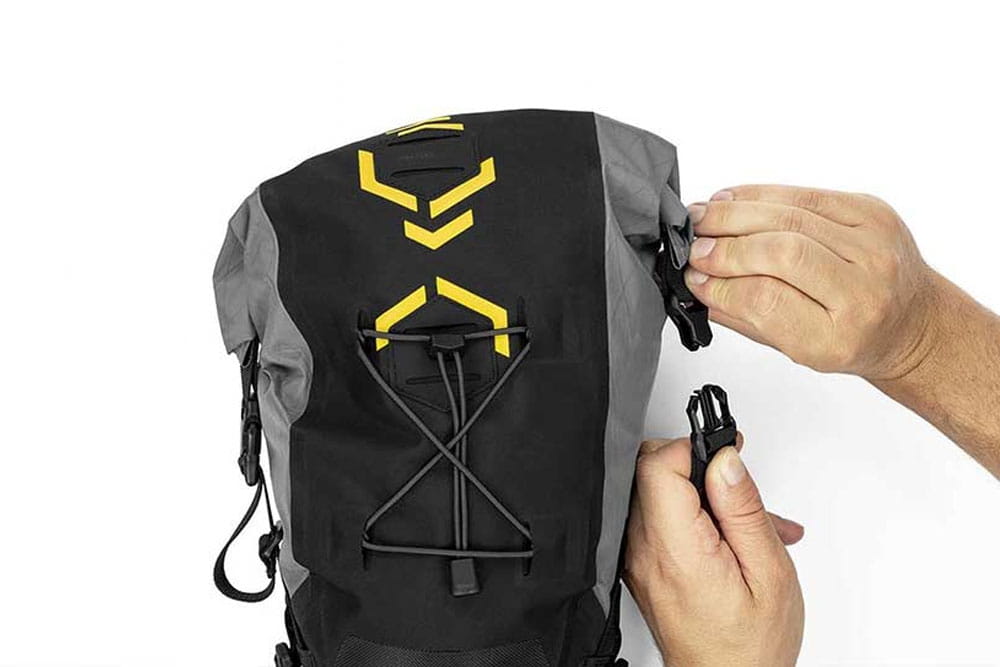Hält sehr gut am Sattel bzw. an der Stütze und kann alles zwischen 4l und 6l aufnehmen durch den sinnvollen, flexiblen Verschluss. Und noch schnell die Windweste unter die Gummies gespannt.