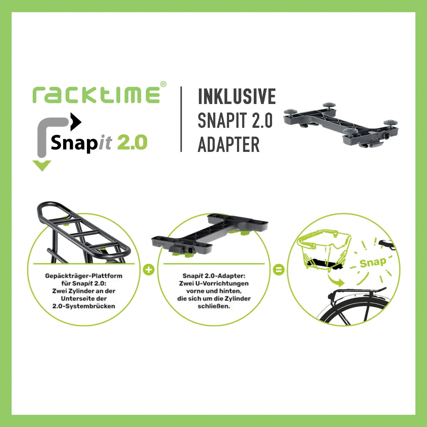 - Du hast keinen Racktime Gepäckträger? Dann findest du für das Snapit 2.0 Modell eine Snapit 2.0 Grundplatte (Art. 37001) bei uns im Shop.