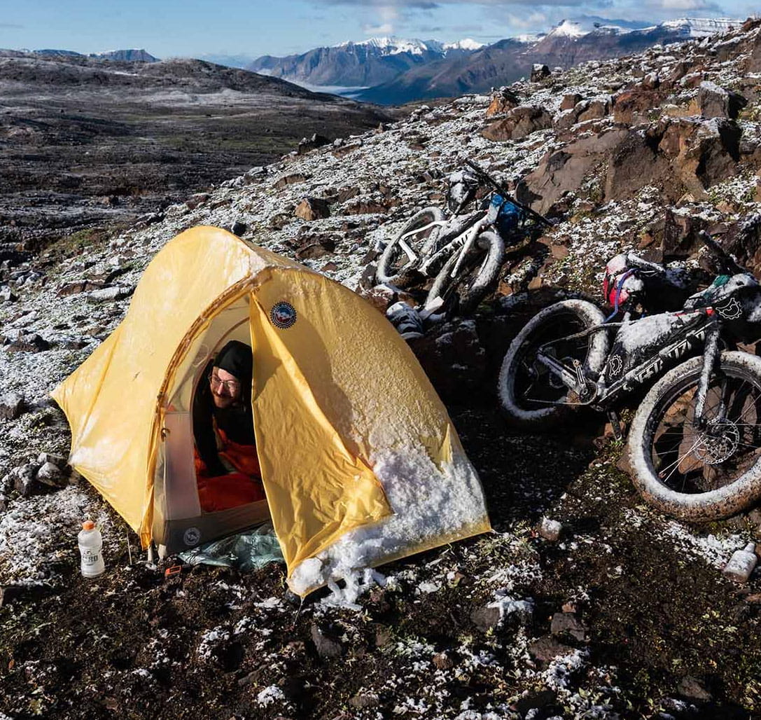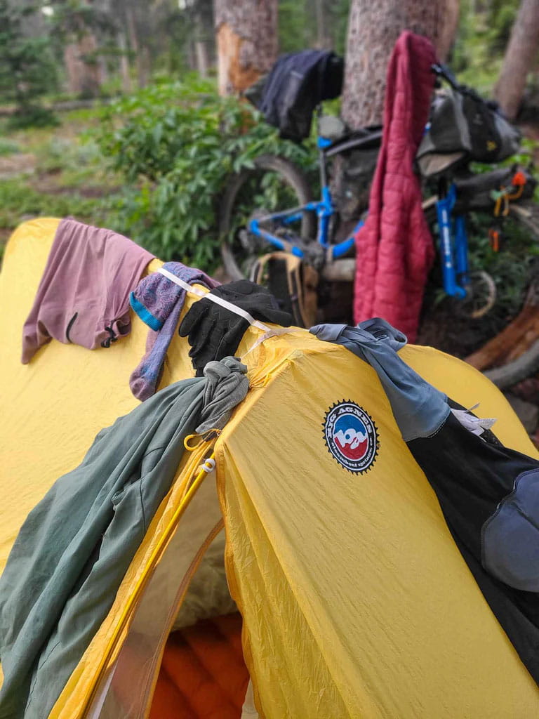 Das Big Agnes Fly Creek HV UL2 Kuppelzelt zeichnet ein kompakter Schnitt und ein kleines Packmaß aus. Der fürs Bikepacking optimierte Packsack lässt sich am Fahrradlenker befestigen.