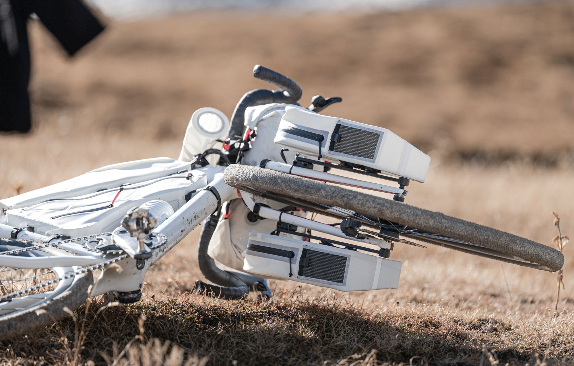 Die Cyclite Fork Bag / 01 eine Gabeltasche für alle Bikepackerinnen und Bikepacker, die zusätzliches Volumen außerhalb des Rahmens benötigen, dabei aber nicht auf Aerodynamik verzichten möchten. Dieses praktische Taschenset enthält je eine Tasche für die linke und rechte Seite der Gabel. Ihr besonderes, flach keilförmig zulaufendes Design sorgt dafür, dass sie besonders windschnittig und aerodynamisch bleibt. In Kombination mit einem tiefen Schwerpunkt bleibt das Fahrgefühl ausgewogen und natürlich.