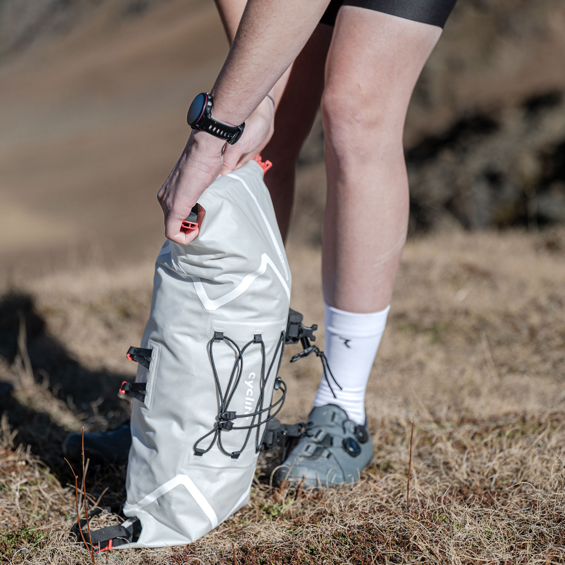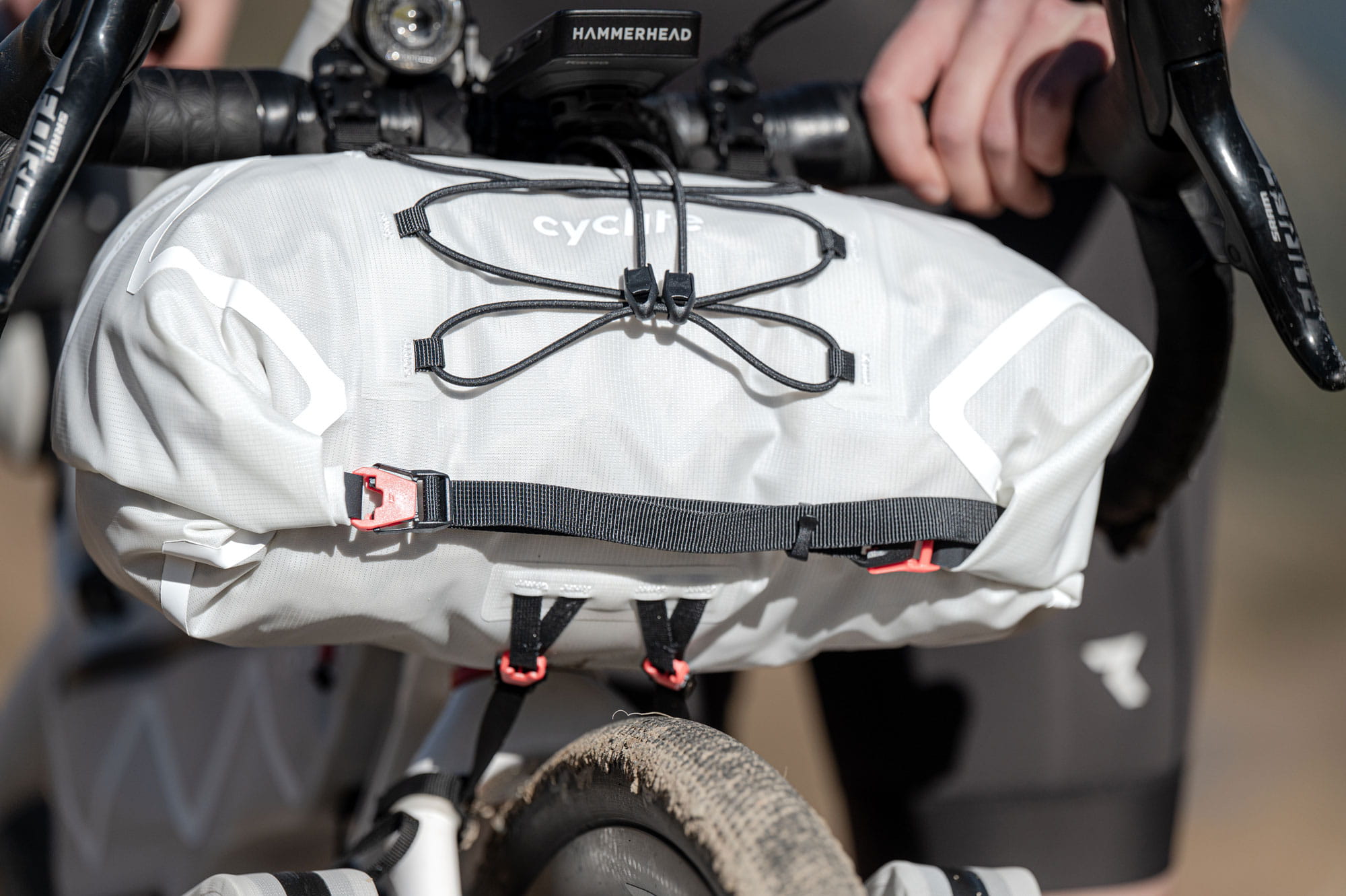 Die Cyclite Handle Bar Roll Bag / 02 Lenkerrolle ist die ultraleichte Option um viel Ausrüstung am Lenker zu befestigen. Einzeln oder in Kombination mit der Handle Bar Aero Bag erweitert sie den Stauraum deutlich und bietet ein gutes Gegengewicht zur Saddle Bag. Der beidseitige Rollverschluss erleichtert das Packen, und mit den mitgelieferten Kompressionsgurten lassen sich die Enden auch optional so gegeneinander verspannen, dass die Bremsgriffe bei Drop Bars nicht behindert werden.