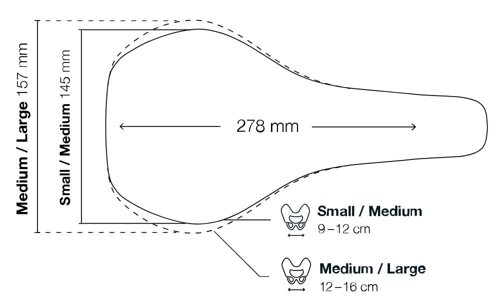 Die hintere Rampe unterstützt die Sitzposition beim Bergauffahren. Die Sattelkontur erleichtert den Wechsel in die Abfahrtsposition beim Fahren hinter dem Sattel. Die V-Form bietet auch Bewegungsfreiheit über die breiten Flanken bis zur gepolsterten Nase – wichtig für besonders steile Anstiege.