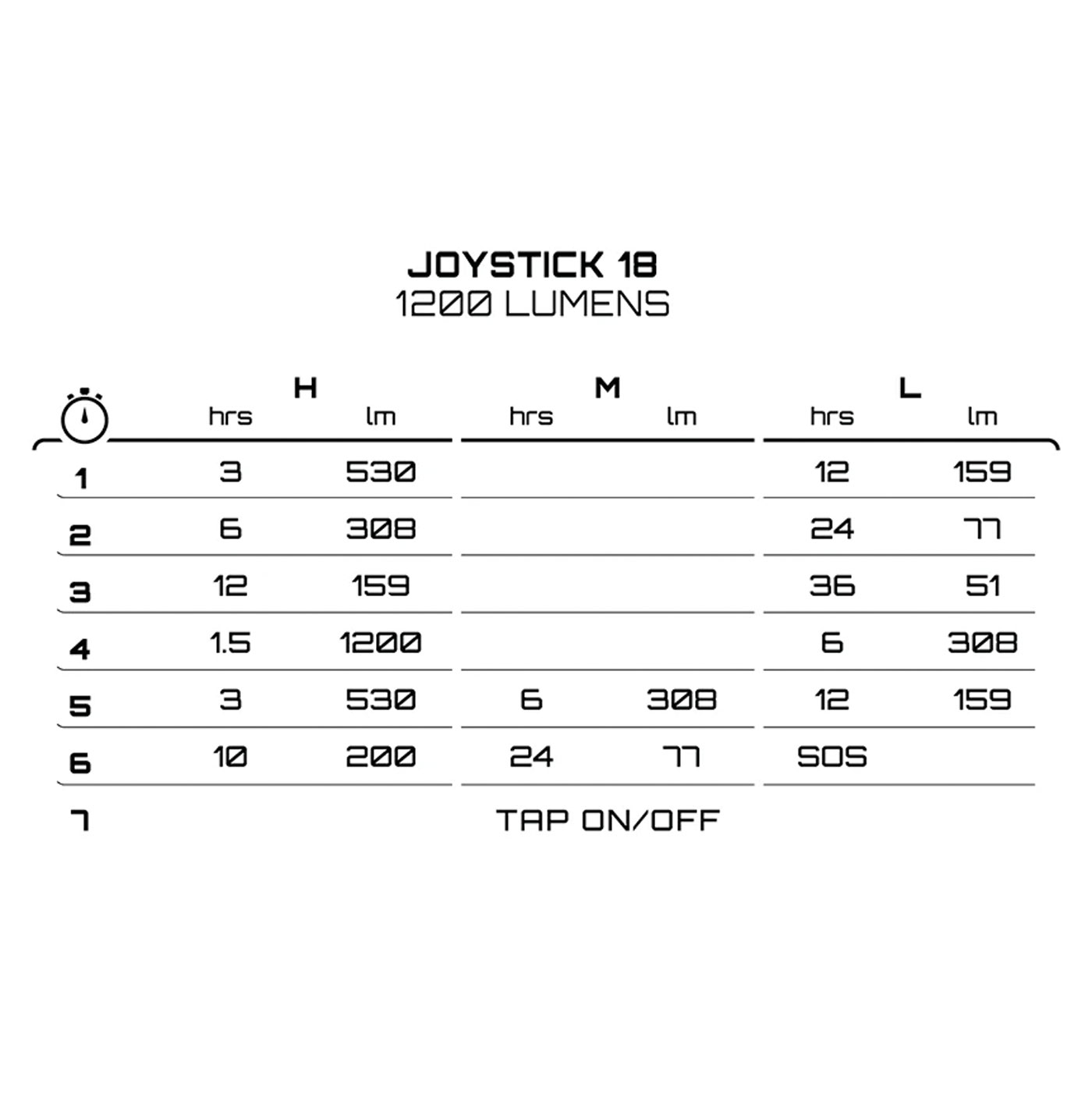 The Joystick 18 light offers six different programs, perfectly adaptable to a variety of uses. In some programs, you can also choose between High, Medium, or Low to adjust brightness and battery life individually. The tap function allows for a quick change of brightness without having to find the button while riding.