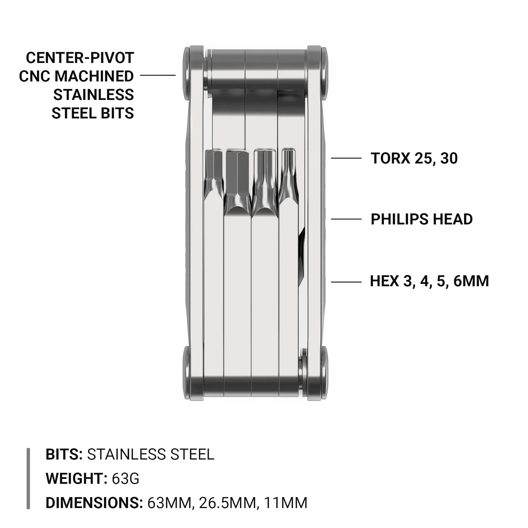 Die Seitenplatten bestehen aus bearbeitetem Aluminium und sorgen für ein ergonomisches Gefühl und ein unverwechselbares Design. Das SV Pro 7 ist ein solider Helfer für jeden Mountainbiker, Gravel- oder Rennradfahrer, der nach dem ultimativen, korrosionsfreien Minitool sucht.
