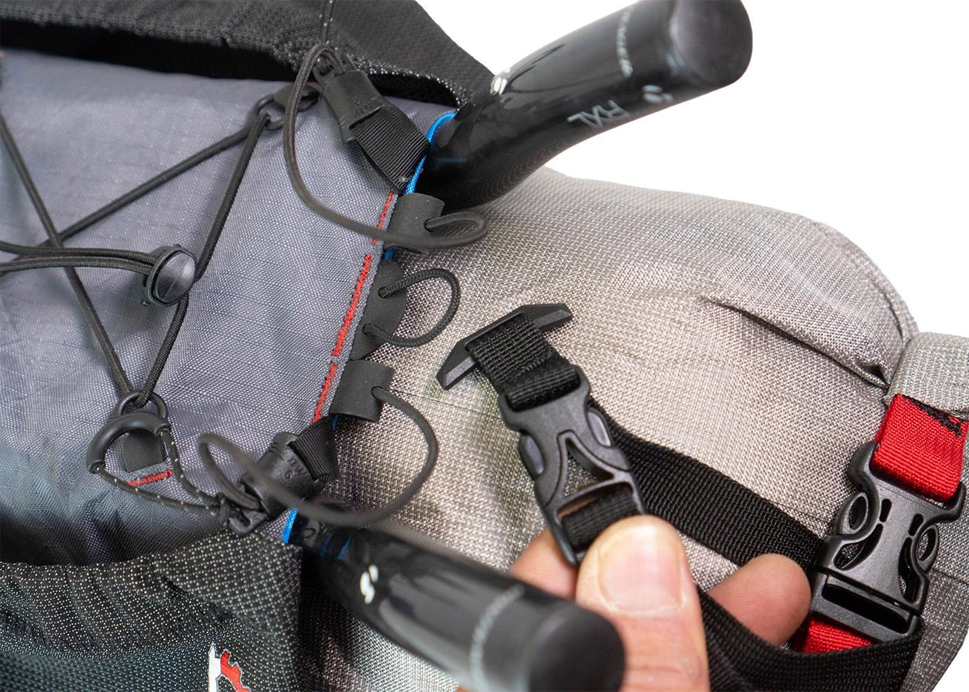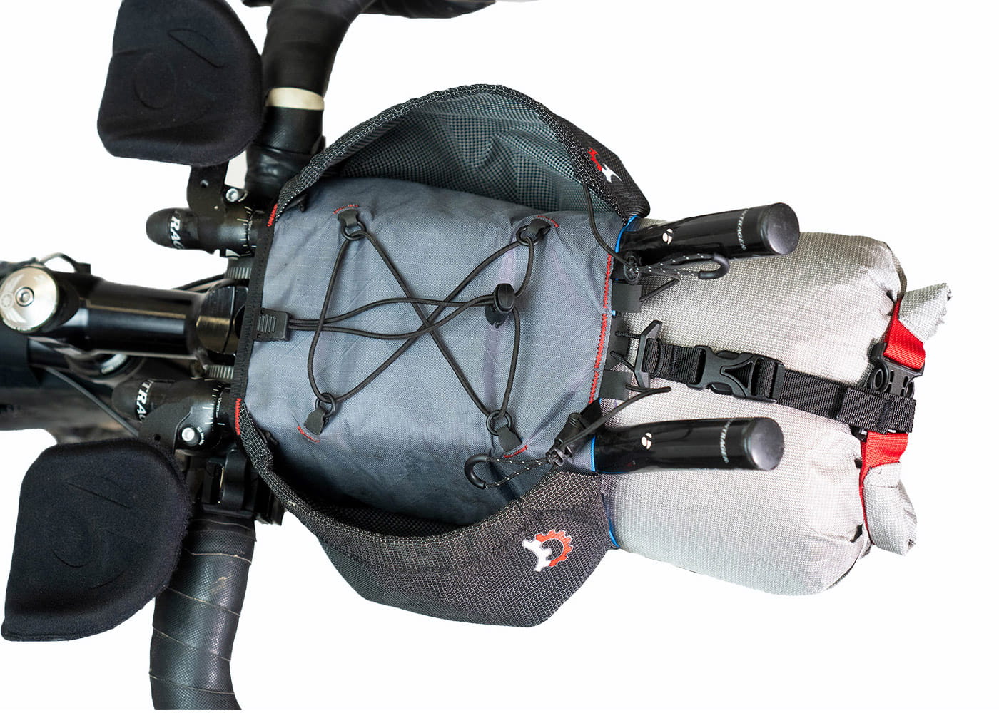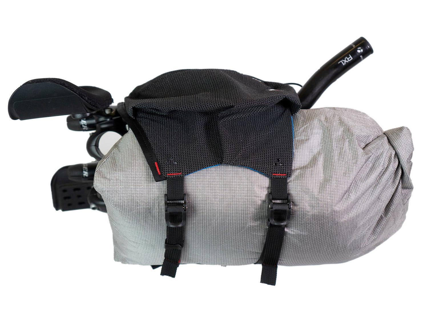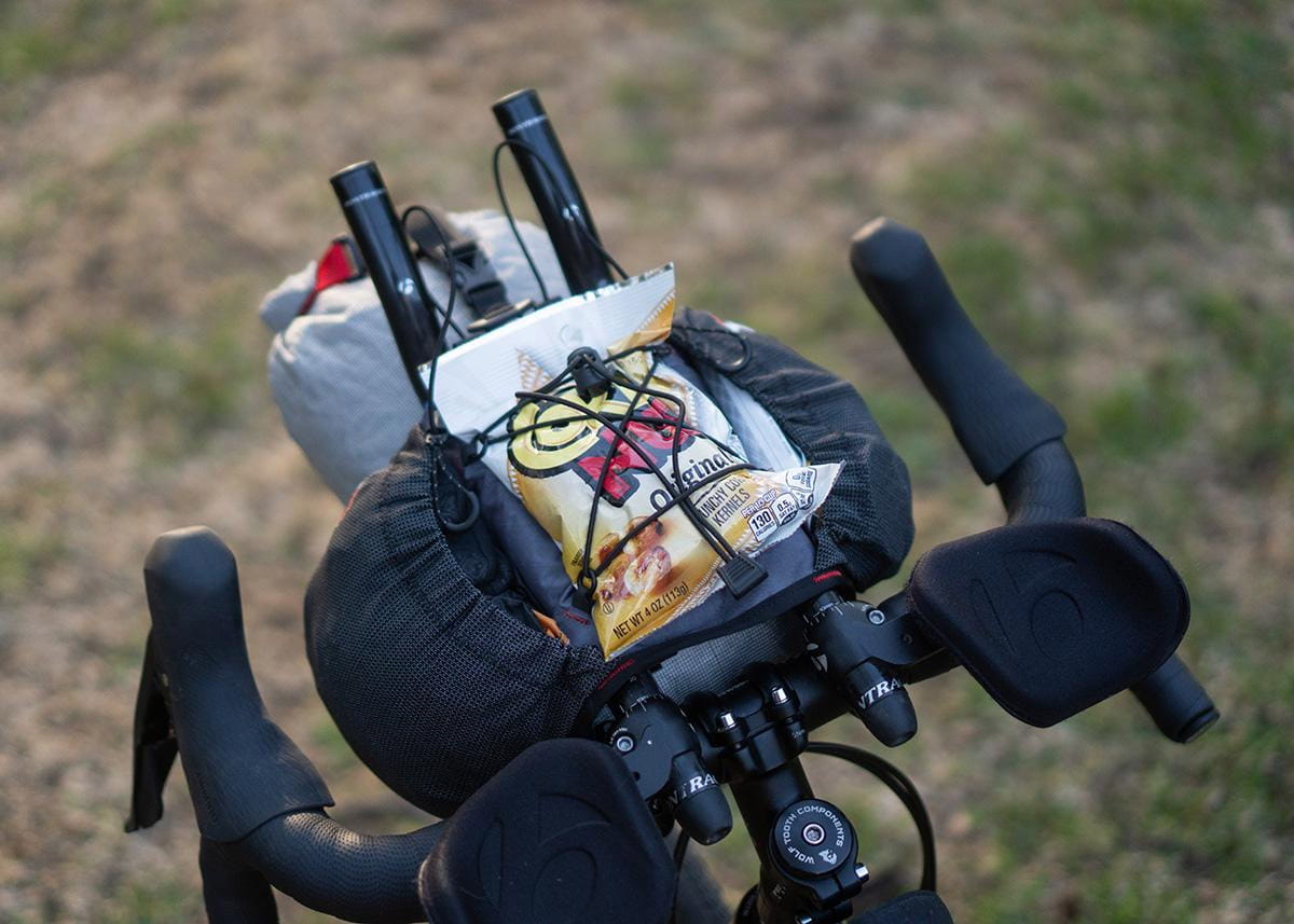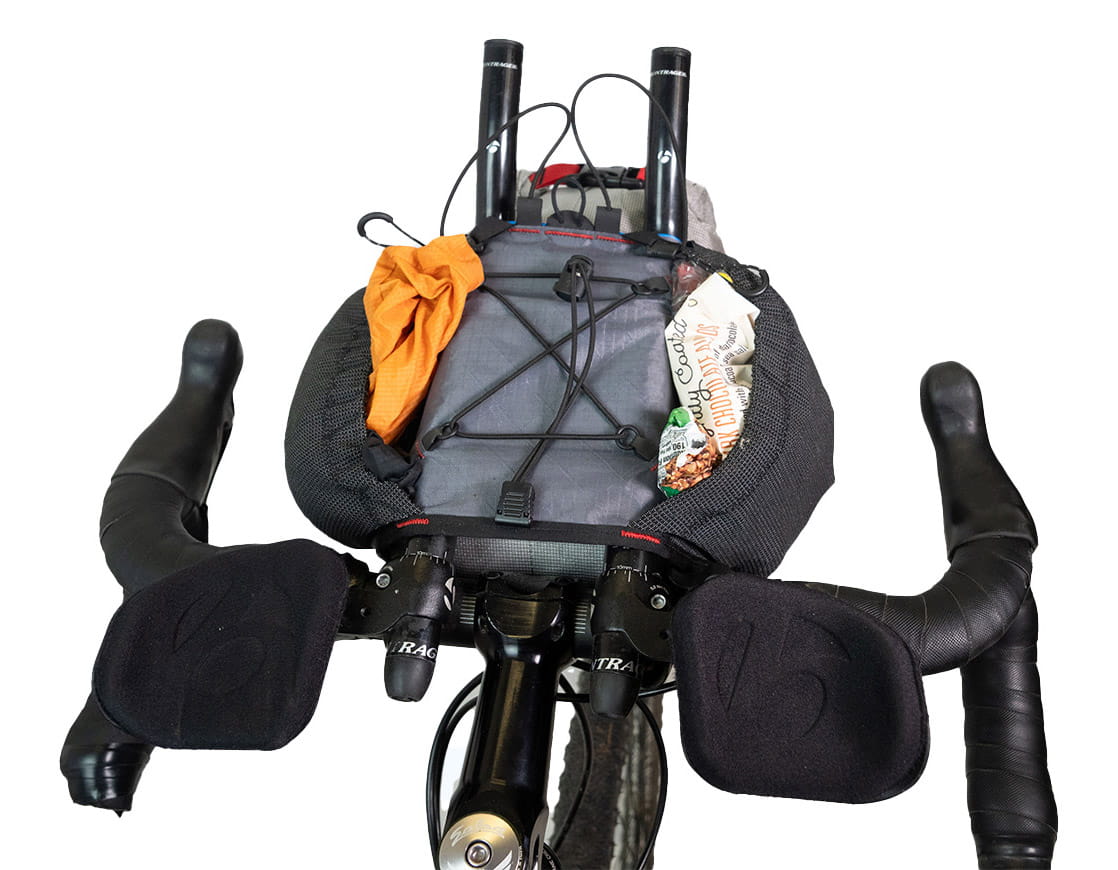 Um die Größe der Taschen zu optimieren, wird das Holster über die Stangen der Aerobars gewickelt, anstatt darunter festgeschnallt zu werden. Dies ermöglicht sowohl mehr Volumen sowie ein praktisches Deck mit Bunge-Kordel an der Oberseite. Alles ist für schnellen Zugriff ausgelegt und alle Kordeln sind auf langen Touren vor Ort austauschbar.