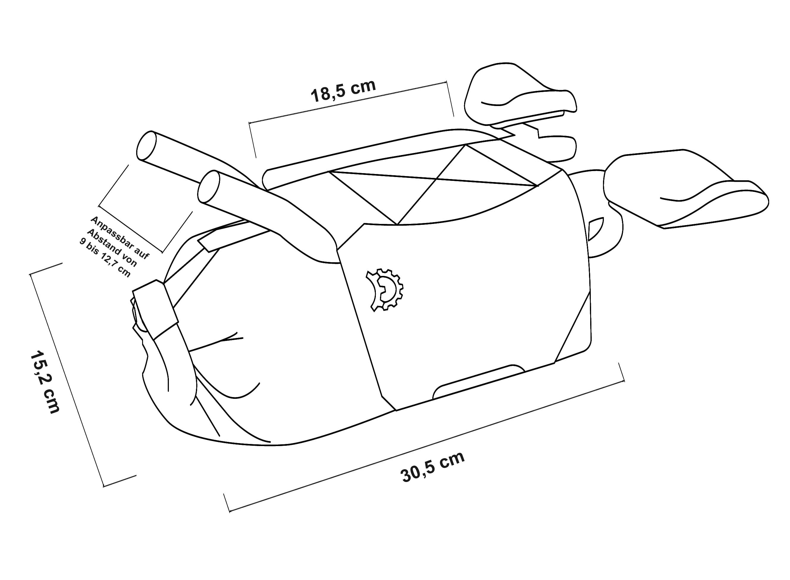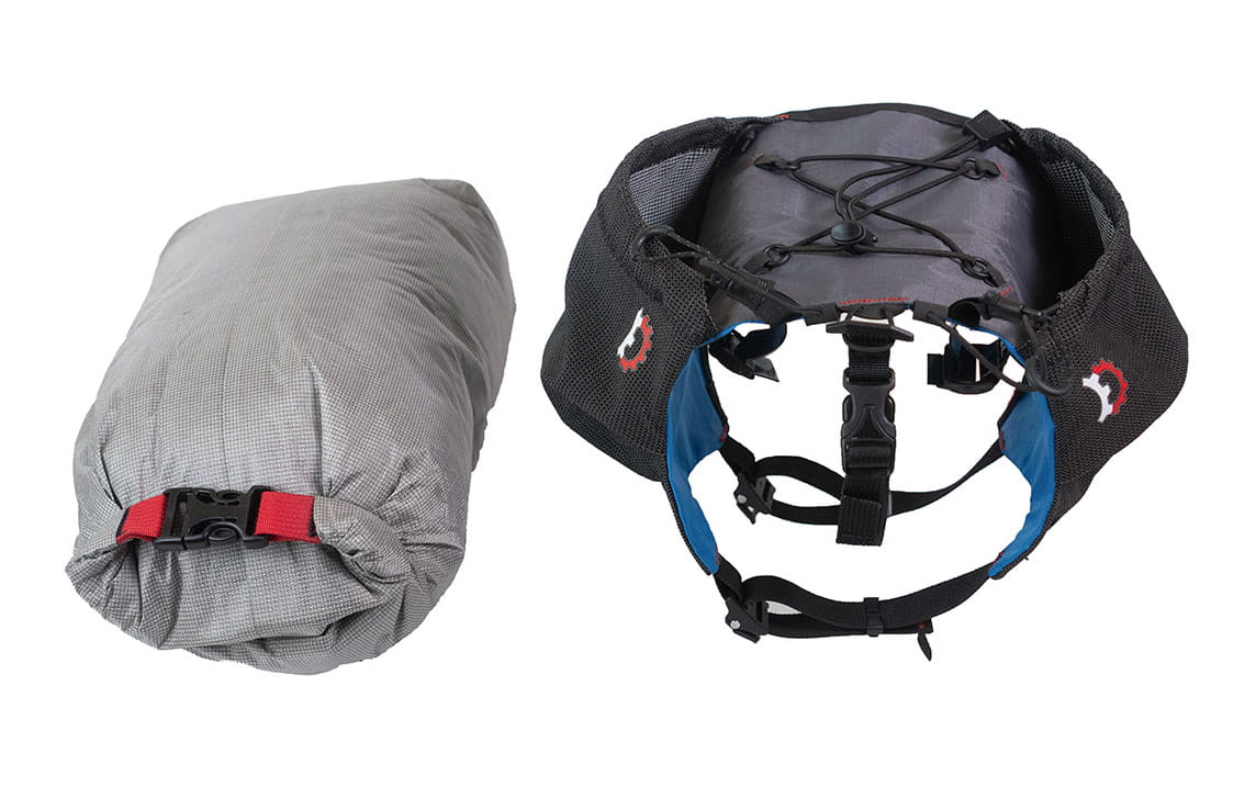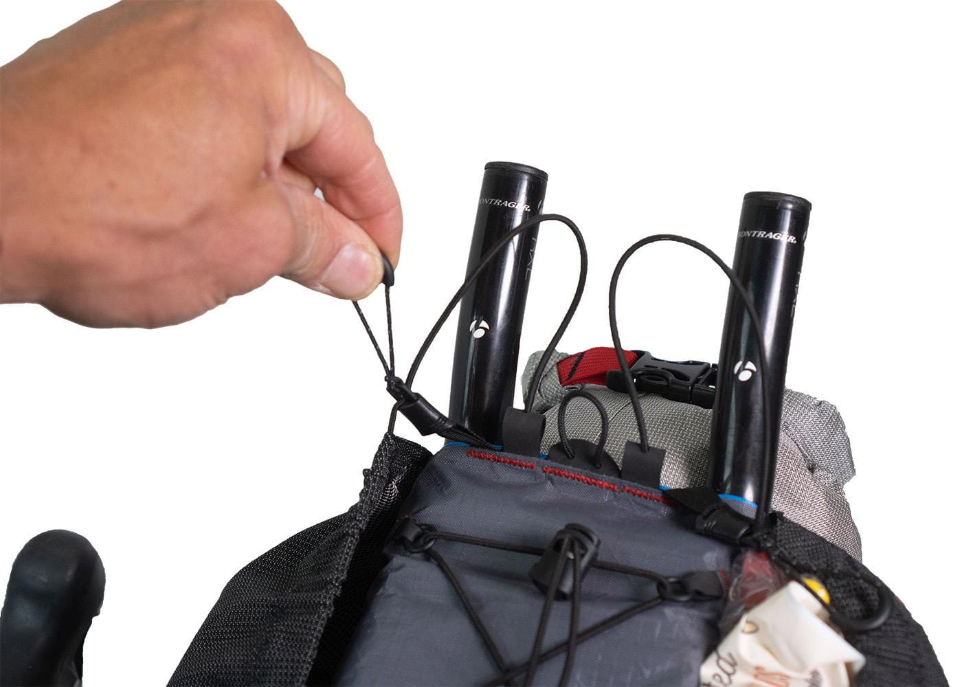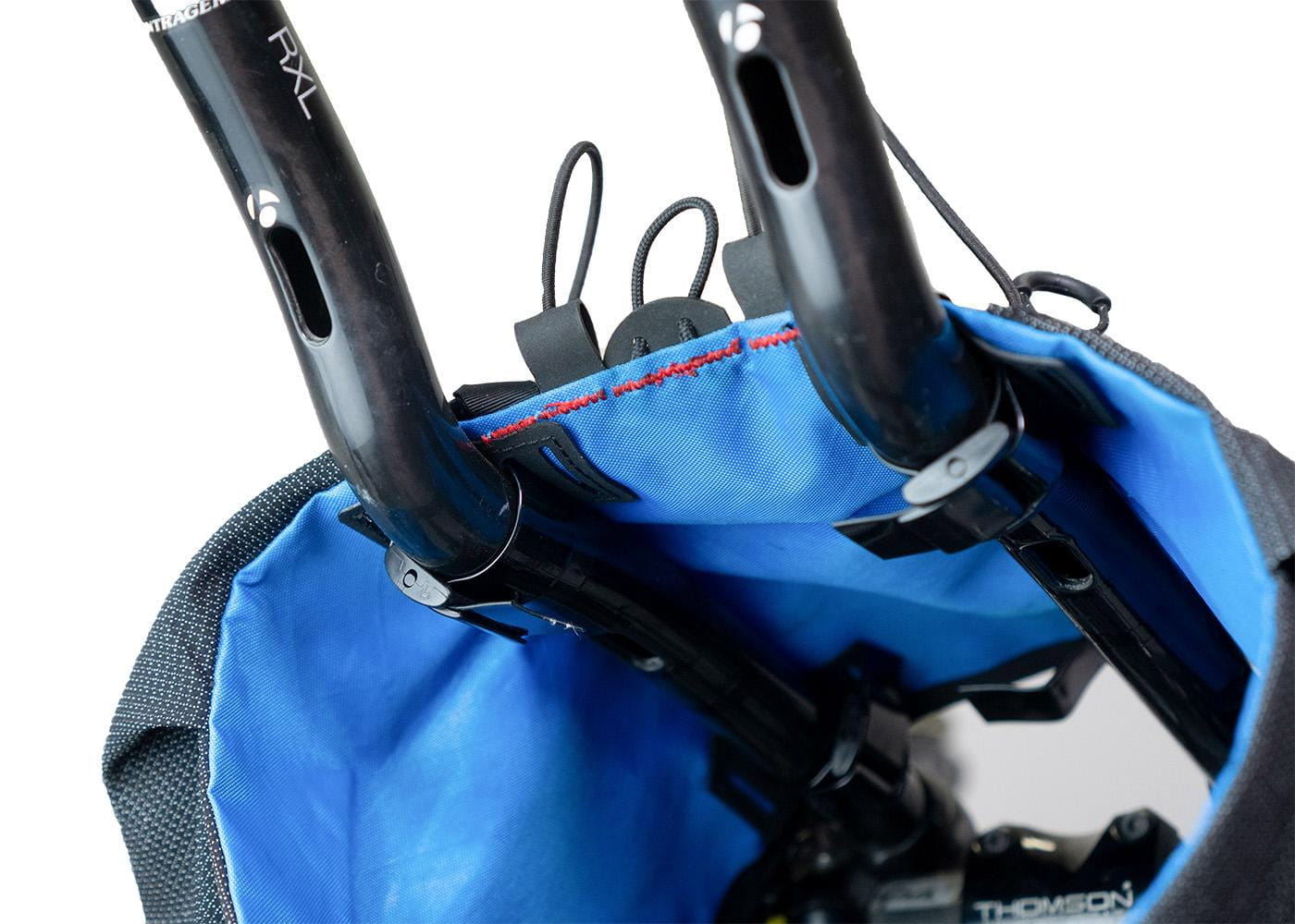Um die Größe der Taschen zu optimieren, wird das Holster über die Stangen der Aerobars gewickelt, anstatt darunter festgeschnallt zu werden. Dies ermöglicht sowohl mehr Volumen sowie ein praktisches Deck mit Bunge-Kordel an der Oberseite. Alles ist für schnellen Zugriff ausgelegt und alle Kordeln sind auf langen Touren vor Ort austauschbar.