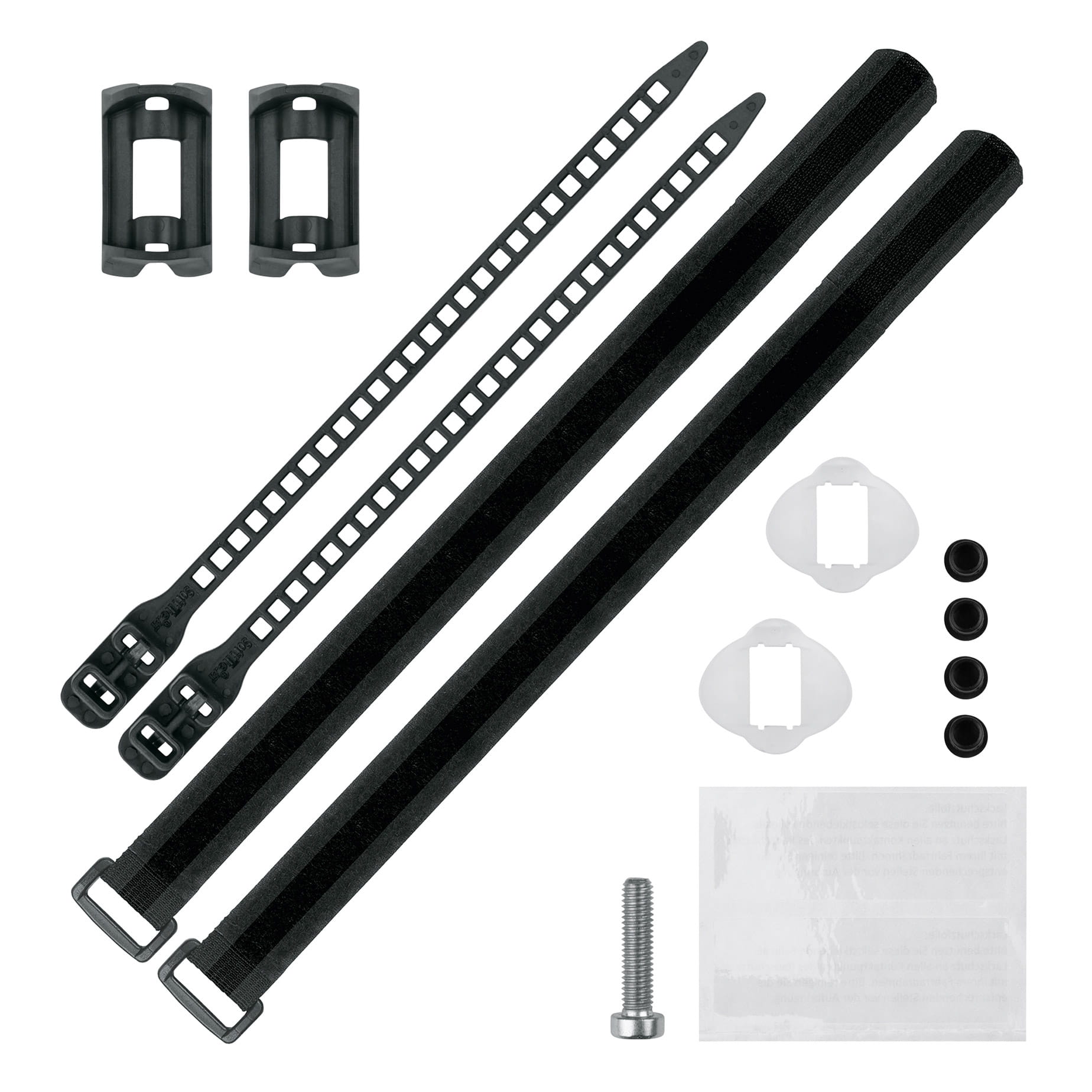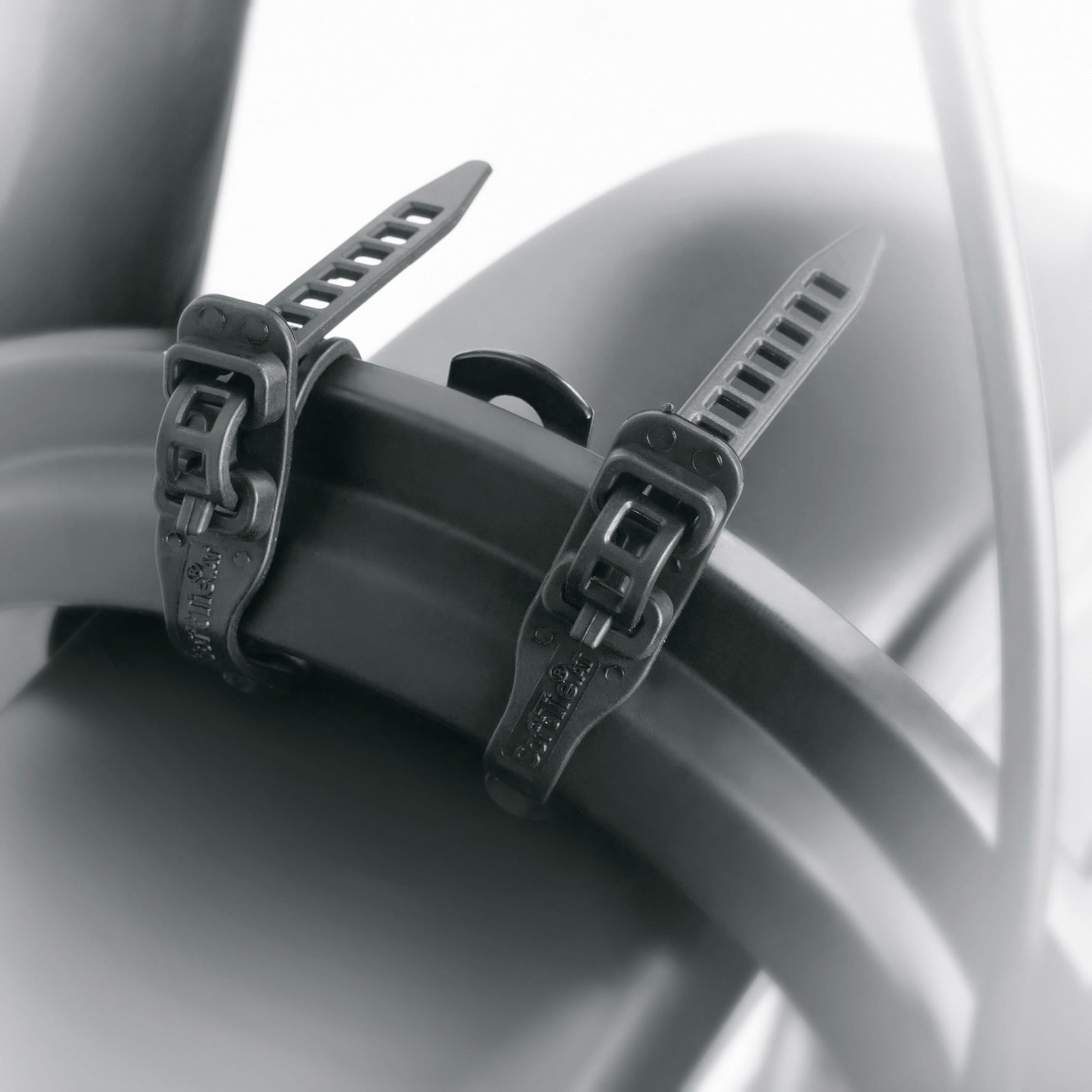 Das INFINITY UNIVERSAL MUDGUARD FRONT mit schwarz mattierter Oberfläche lässt sich im Handumdrehen an der Gabelbrücke über einen Winkel verschrauben oder mit Softbindern befestigen. Die Unterlaufstrebe wird mit robusten Klettgurten an der Gabel montiert.