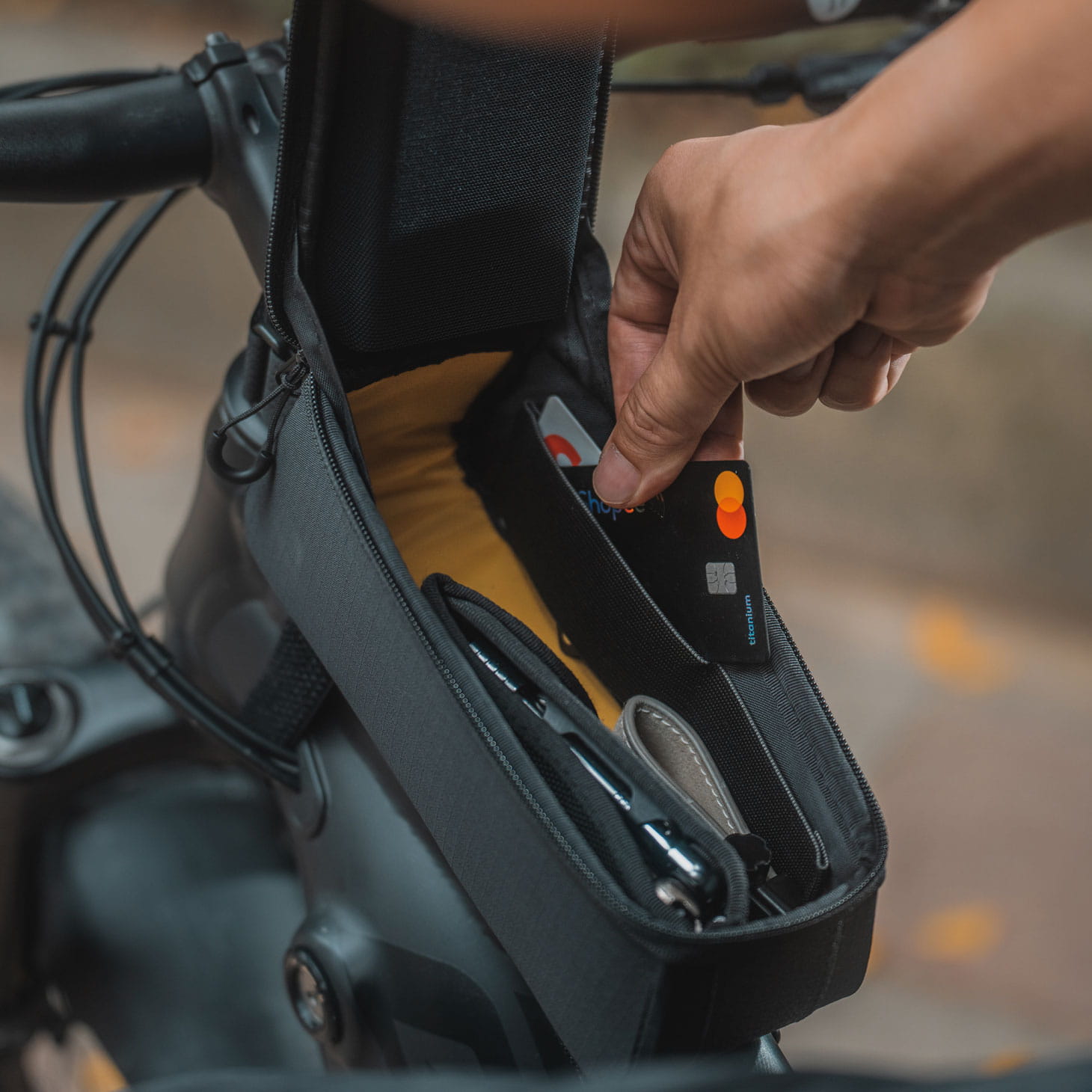 Dank des 2-in-1-Designs der Bento Bag hast du auch während der Fahrt dein Smartphone im Blick. Das zweite Fach der Tasche verfügt über Trennwände, mit denen Du kleine Gegenstände wie Kreditkarten, Kleingeld, Schlüssel und andere persönliche Gegenstände einfach organisieren und aufbewahren kannst.