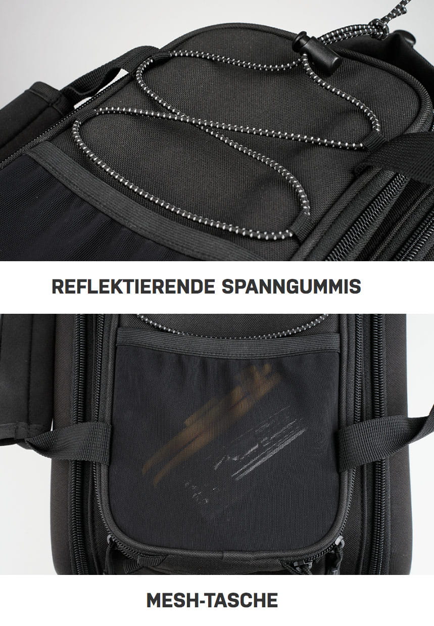 - Mesh-Tasche und reflektierende Spanngummis auf der Oberseite