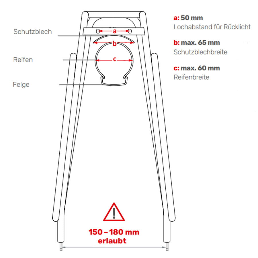 Die maximale Tragfähigkeit dieses Gepäckträgers ist auf 26 kg beschränkt, da die ISO 11243:2016 bei einer zulässigen Tragfähigkeit von 27 kg oder mehr die Befestigung von Kindersitzen zulässt. Der Gepäckträger ist nicht für die Befestigung von Kindersitzen und folglich auch nicht für den Transport von Kindern zugelassen, weshalb die Tragfähigkeit auf 26 kg beschränkt werden muss. Der Gepäckträger hat die Prüfung entsprechend ISO 11243:2016 mit einer Prüflast von 40 kg erfolgreich bestanden, ist aber aus den genannten rechtlichen Gründen nur bis 26 kg Maximallast zugelassen.