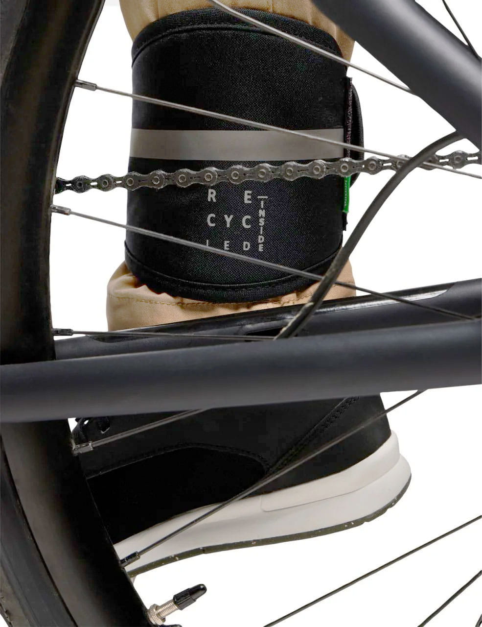 Das Vaude Chain Protection Klett-Reflexband verhindert, dass sich das Hosenbein in Kette oder Kettenblatt verfängt und schützt es somit vor Ölflecken.