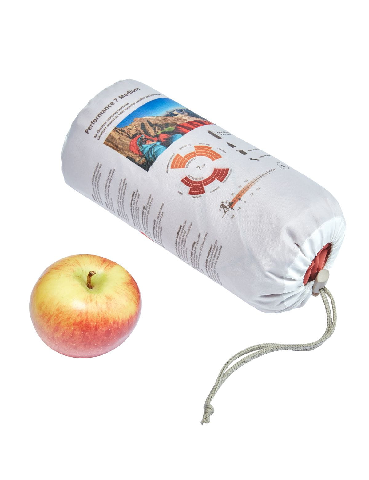 Die Performace 7 ist für Tourengeher, die beim Gepäck auf jedes Gramm Gewicht achten wollen. Eine spezielle Konstruktion in Verbindung mit nachhaltigen und hochwertigen Materialien und die "eiförmige" Liegefläche ermöglichen das sehr niedrige Gewicht. Auf der Isomatte liegt es sich sehr komfortabel und die eingearbeitete Primaloft®-Wattierung aus recycelten PET-Flaschen schützt zuverlässig vor Bodenkälte.