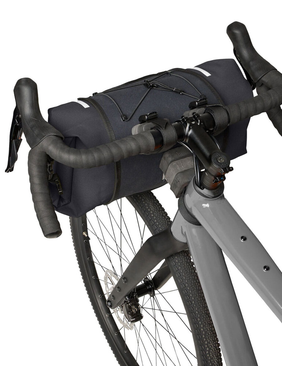 Die VAUDE Trailfront Cage ist eine durchdachte Bikepacking-Lenkerrolle für alle, die unterwegs flexibel bleiben möchten. Das System besteht aus einer stabilen Halterung, die dauerhaft am Lenker montiert bleibt, und einem wasserdichten Packsack, der bei Bedarf schnell entnommen werden kann. So kannst Du den Packsack beispielsweise abends mit ins Zelt nehmen, während die Halterung am Fahrrad bleibt.
