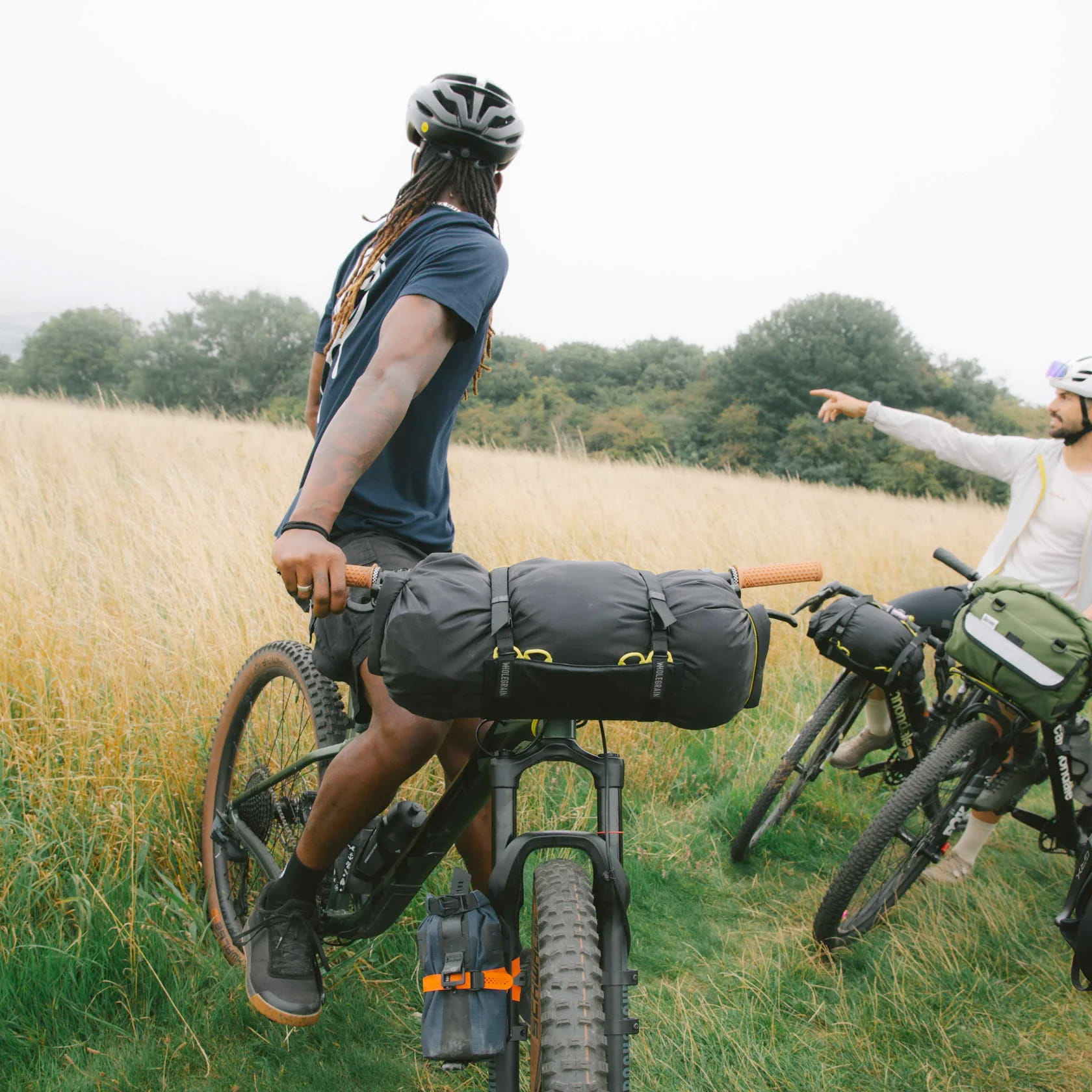 The smart V-shaped cradle stabilizes the drybag reliably and reduces movement during your ride. Two strong handlebar straps plus an additional fixation on the steerer tube ensure a secure fit – even on rough trails. Thanks to the modular design, you can also use other drybags if needed or combine the handlebar roll with other WholeGrain Cycles system components.