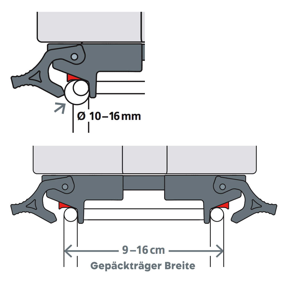 - Universell einstellbar: passend für Rohrdurchmesser Ø 10–16 mm und Gepäckträger-Breite 9–16 cm