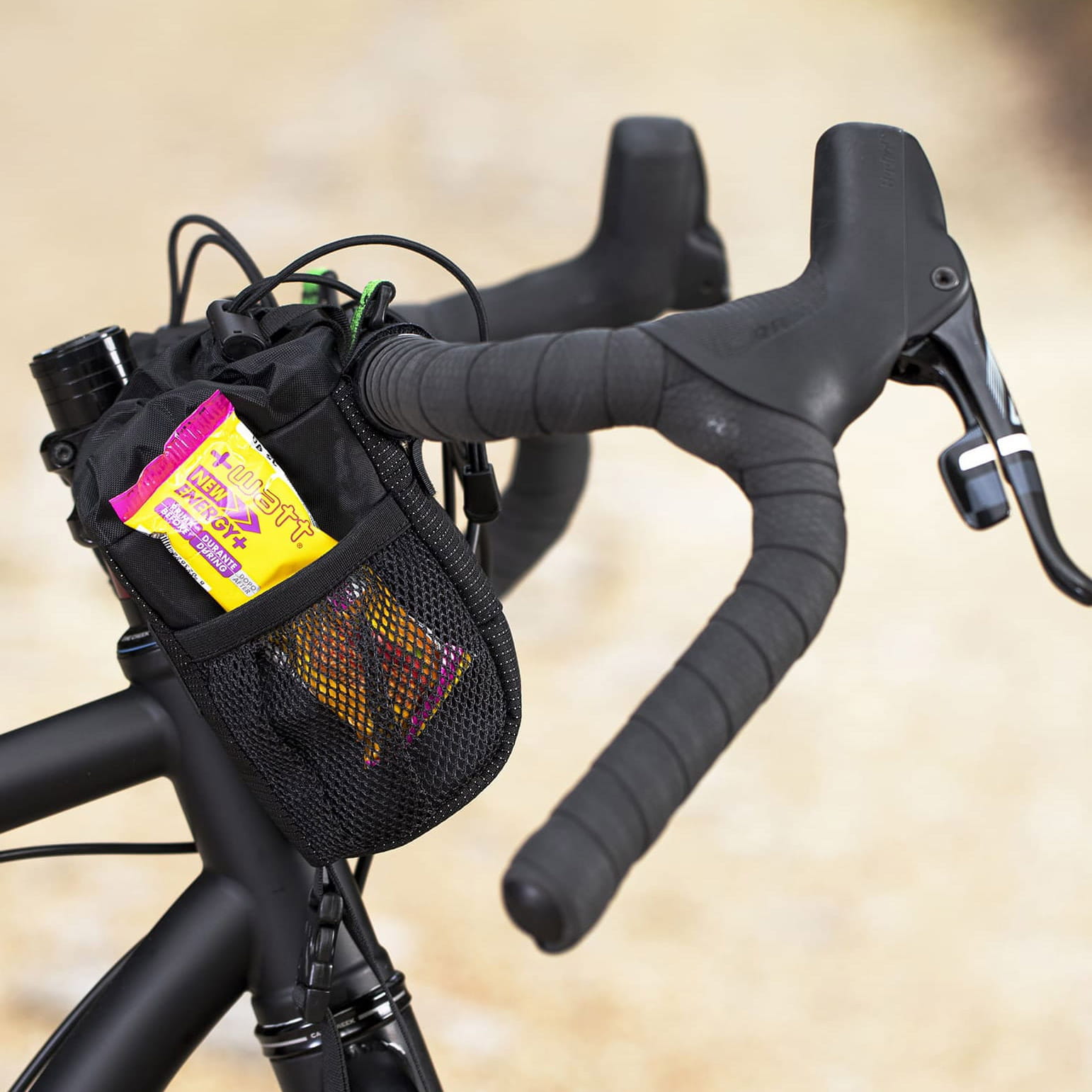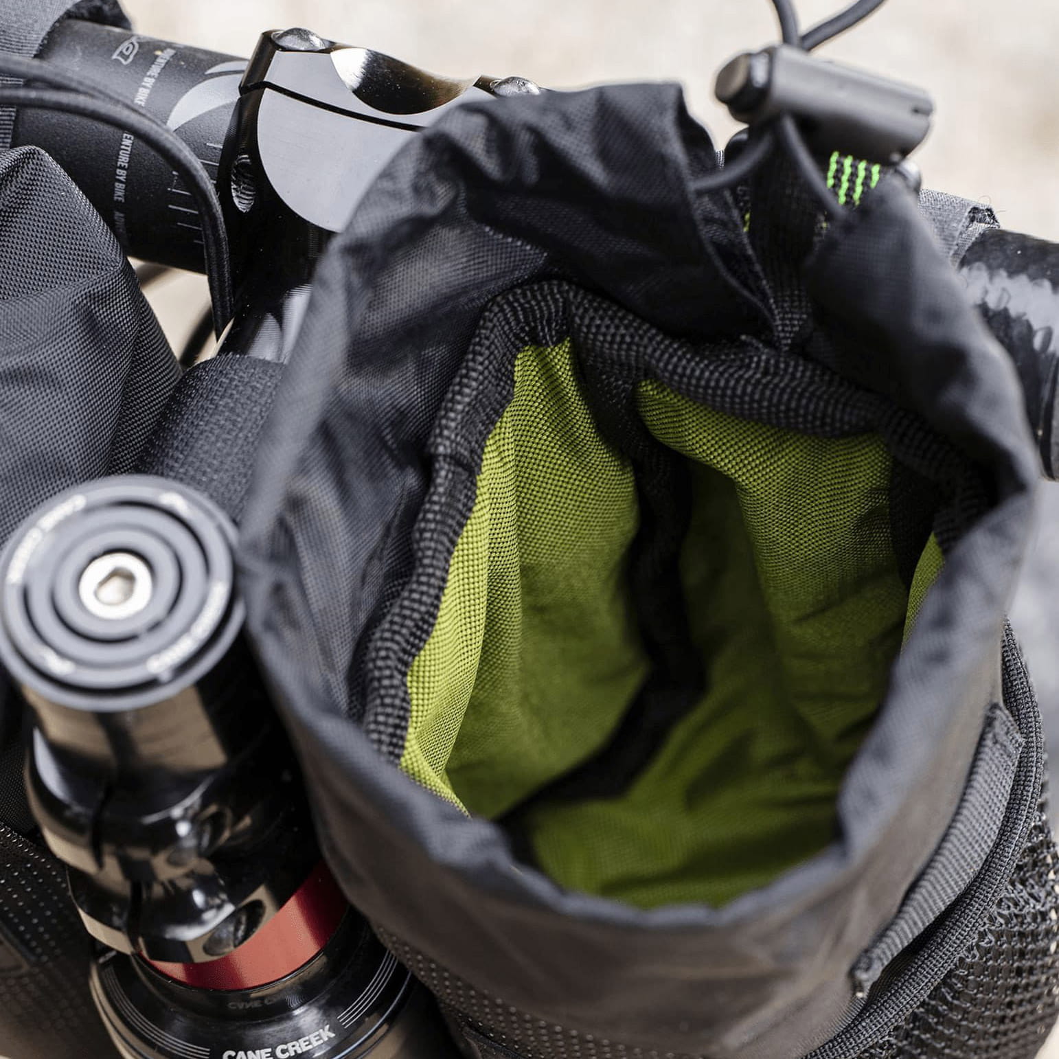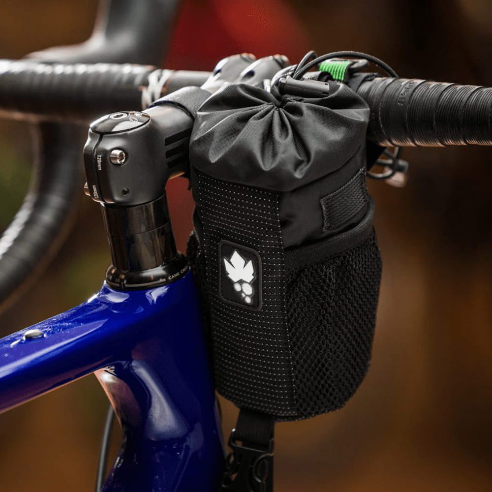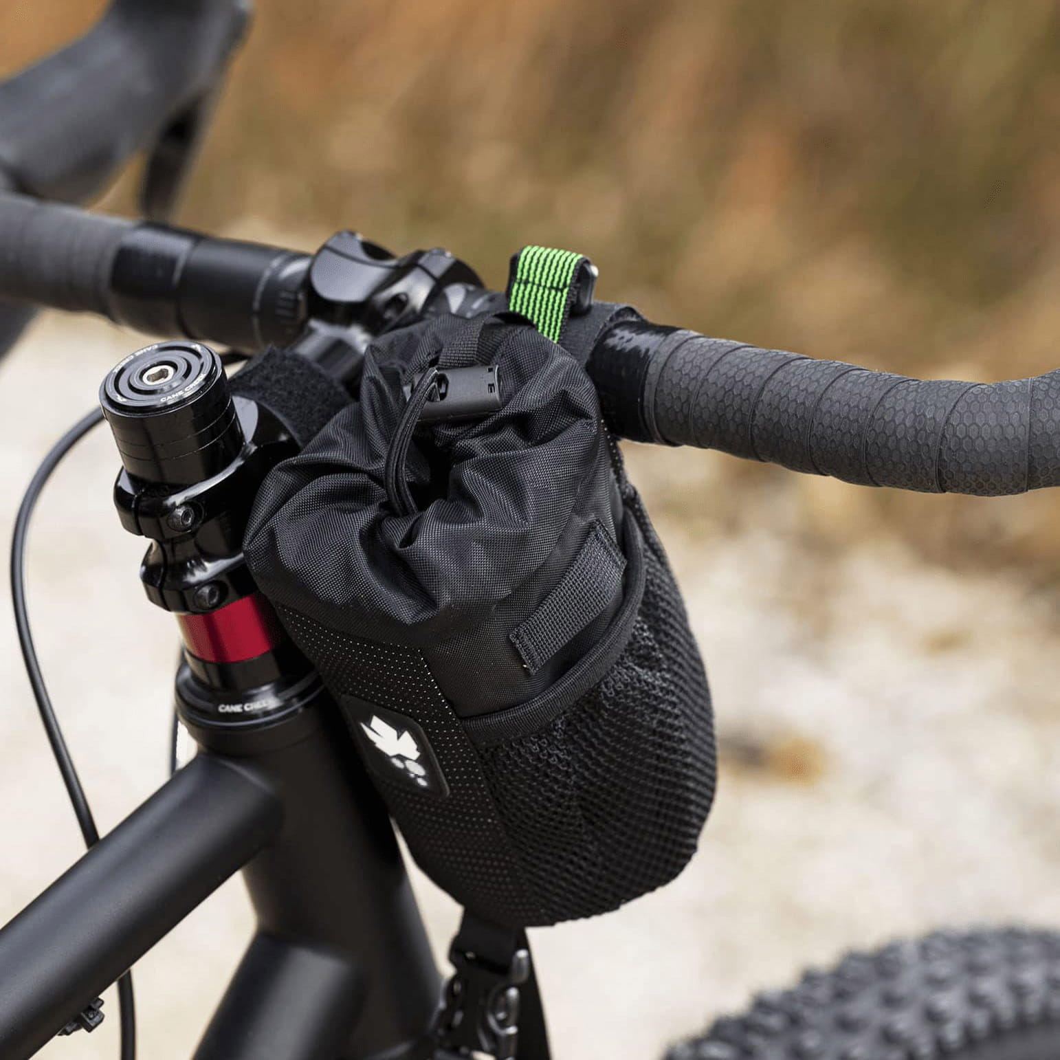 Die Bud Food Pouch wird mit zwei Velcro™-Riemen zwischen Lenker und Vorbau montiert und mit einem Gurtband an der Gabelkrone befestigt.