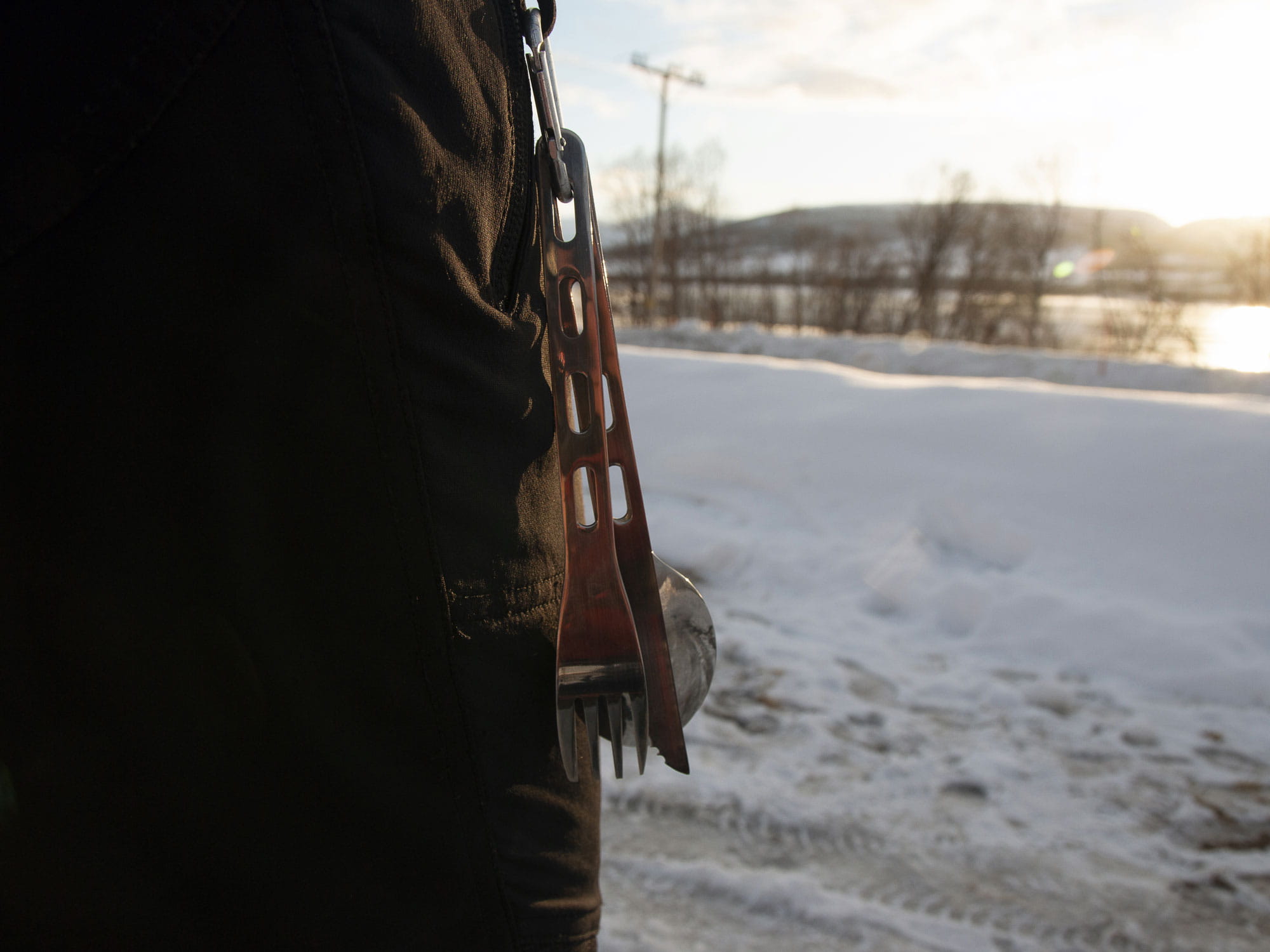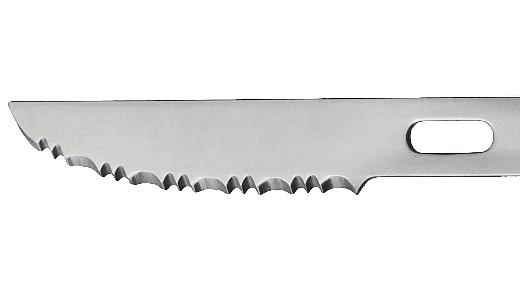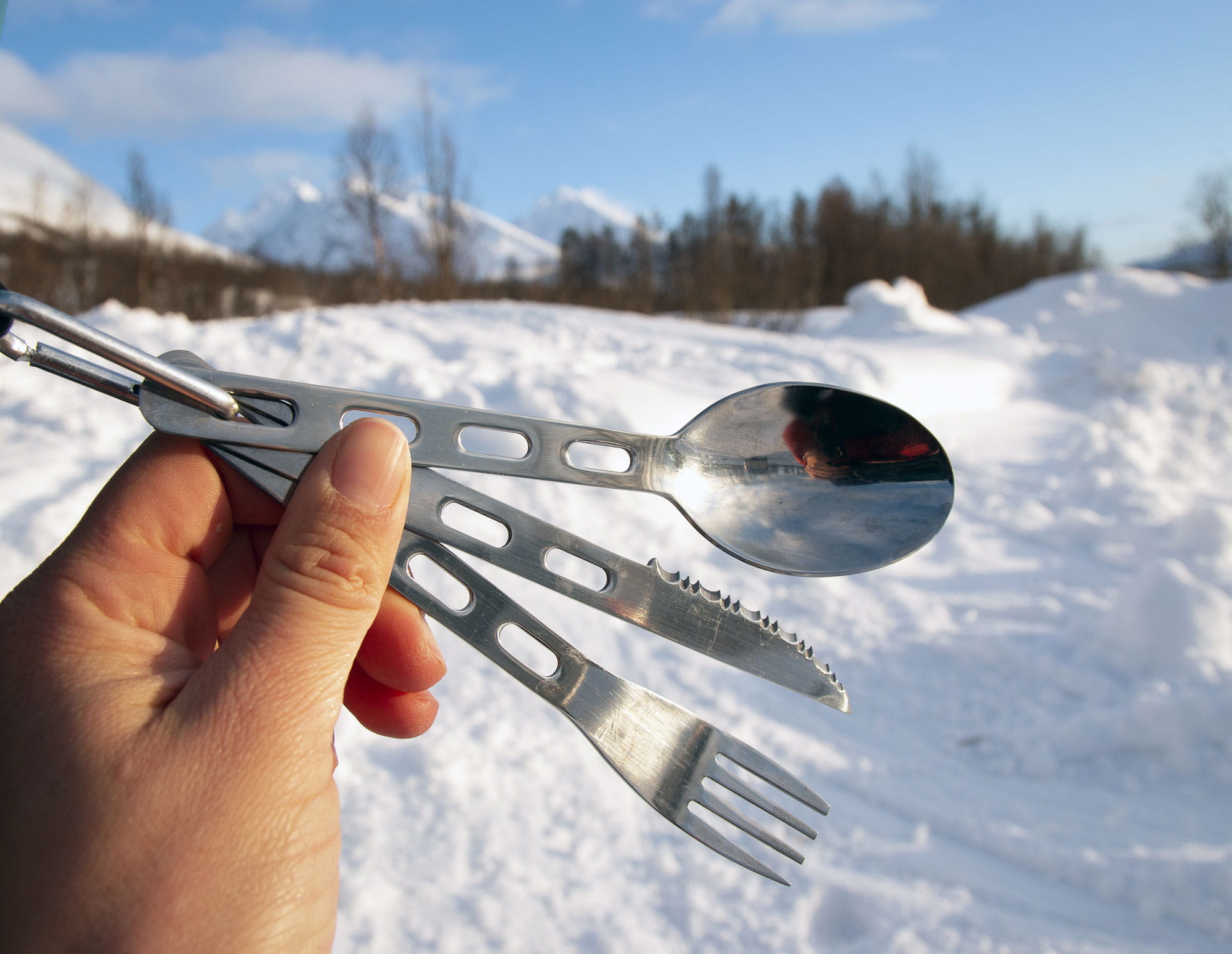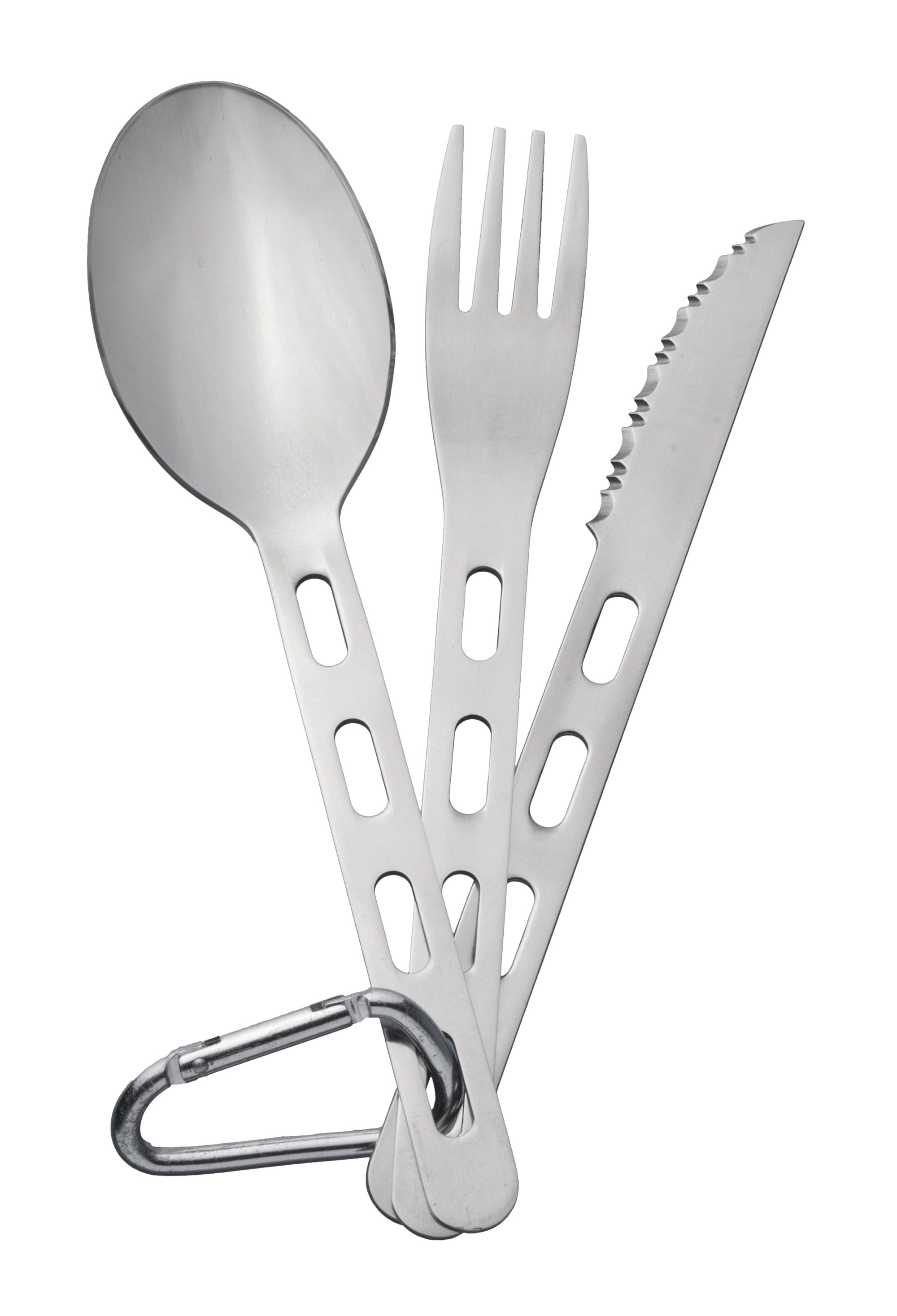 Robustes Besteckset mit scharfem Sägemesser, Gabel und Löffel für den Einsatz in der freien Wildbahn. Das Set wird mit praktischem Neoprenbeutel und Karabiner geliefert.