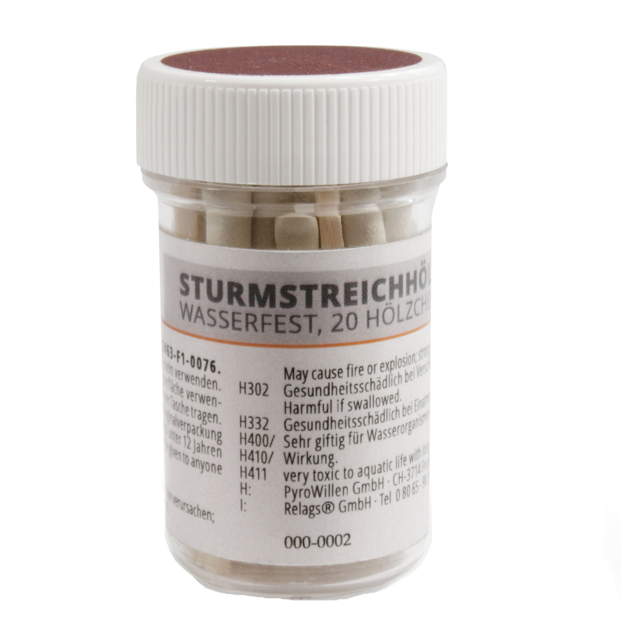 In dieser kleinen Plastikdose mit Schraubverschluss und Reibfläche (auf dem Deckel), sind die Hölzer spritzwassergeschützt und sicher untergebracht. Die Sturmstreichhölzer haben einen langen Schwefelkopf und brennen deshalb auch bei stärkerem Wind. Die Schutzschicht über dem Hölzchen macht diese wasserfest.