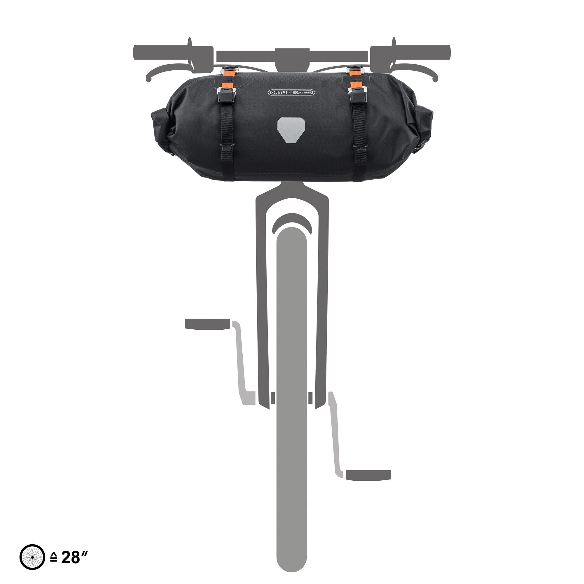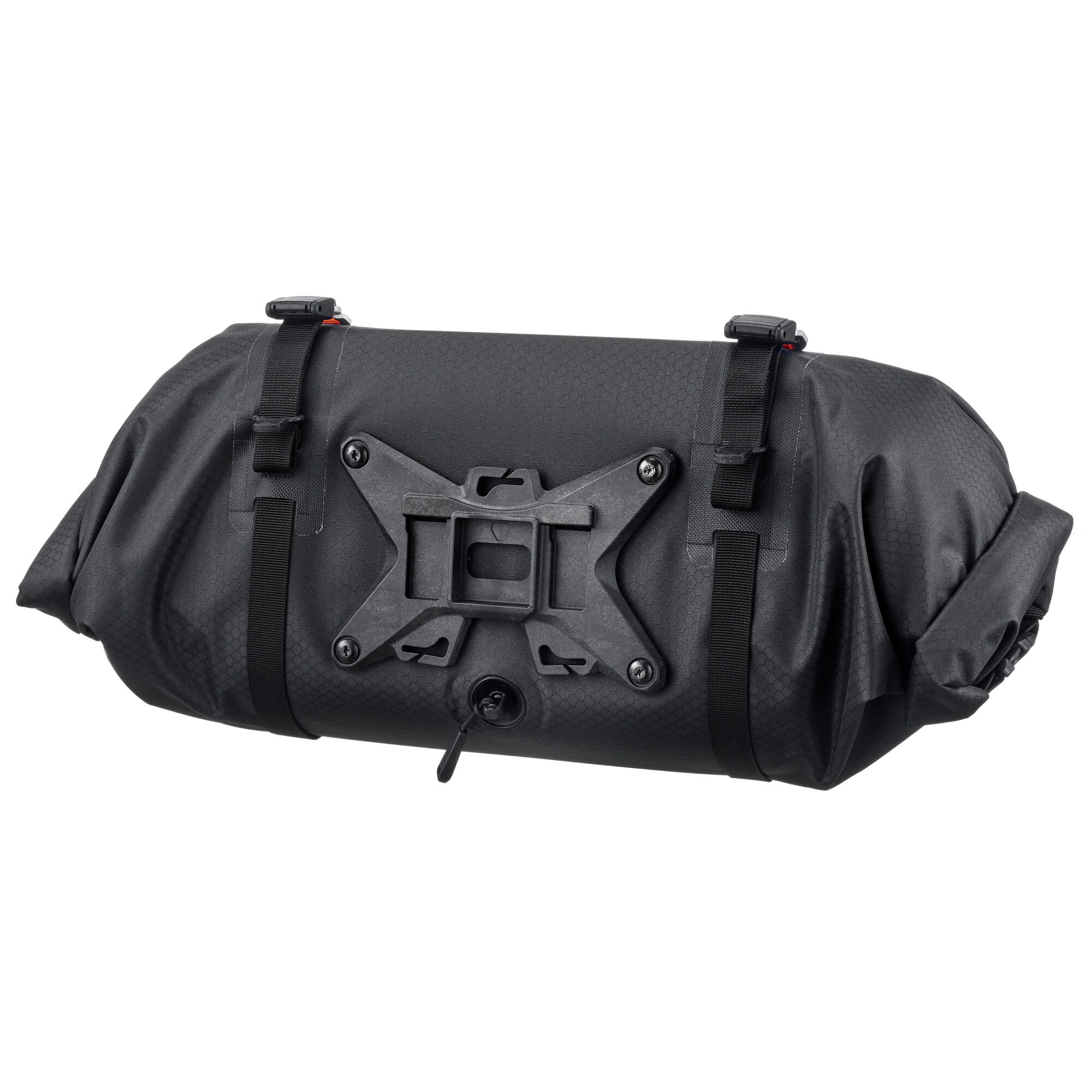 Durch die robuste Konstruktion, bestehend aus einer internen Kunststoffversteifung und einer zusätzlichen Fixierung am Steuerrohr, bleibt die Tasche auch auf unwegsamem Gelände zuverlässig in Position. Außerdem bietet die wasserdichte Lenkertasche ausreichend Platz für Schlafsack und Isomatte mit kleinem Packmaß und sorgt für eine ausgeglichene Lastenverteilung am Fahrrad.