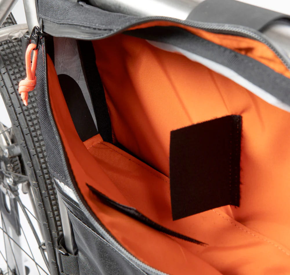 Zwei wasserdichte YKK-Reißverschlüsse auf der rechten Seite ermöglichen den schnellen Zugriff auf das obere und untere Fach. Im Inneren kannst du dank flexibler Klett-Trennwände selbst entscheiden, ob du getrennte Fächer oder ein großes Hauptfach nutzen möchtest. Auf der linken Seite befindet sich eine Dokumententasche für Karten, Schlüssel oder Werkzeug.