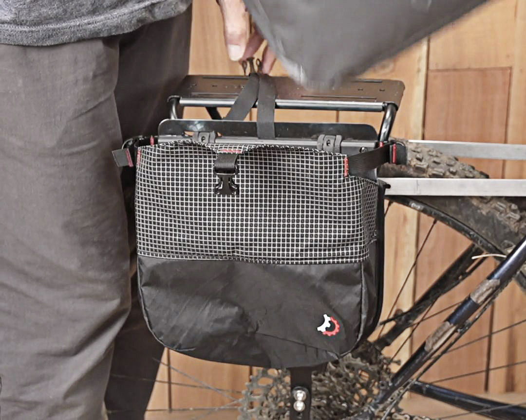 Revelate nutzt ein durchdachtes System aus gummierten, verschiebbaren Haken, die sich an nahezu alle Gepäckträger anpassen lassen — egal ob klassische Stahlträger, MTB-spezifische Varianten oder moderne Aluminium-Racks.