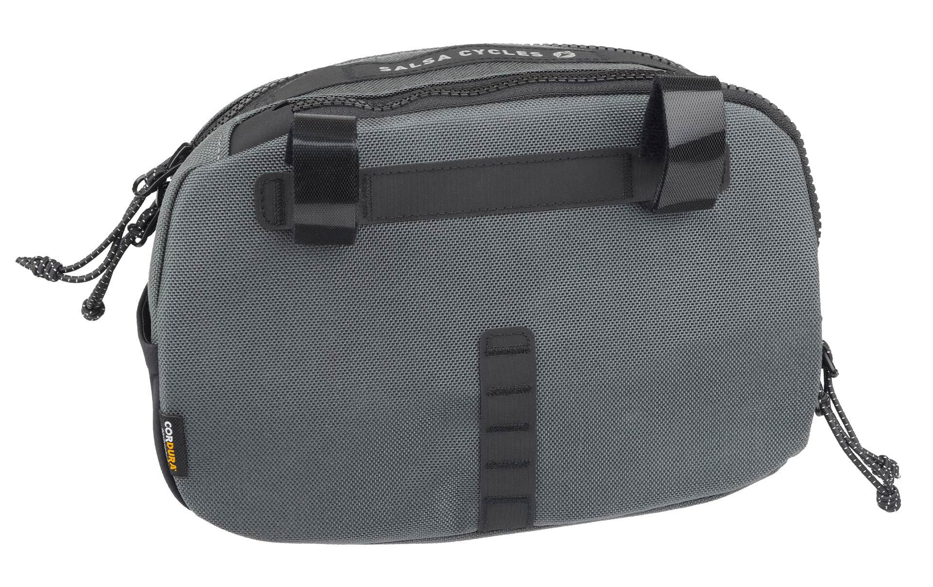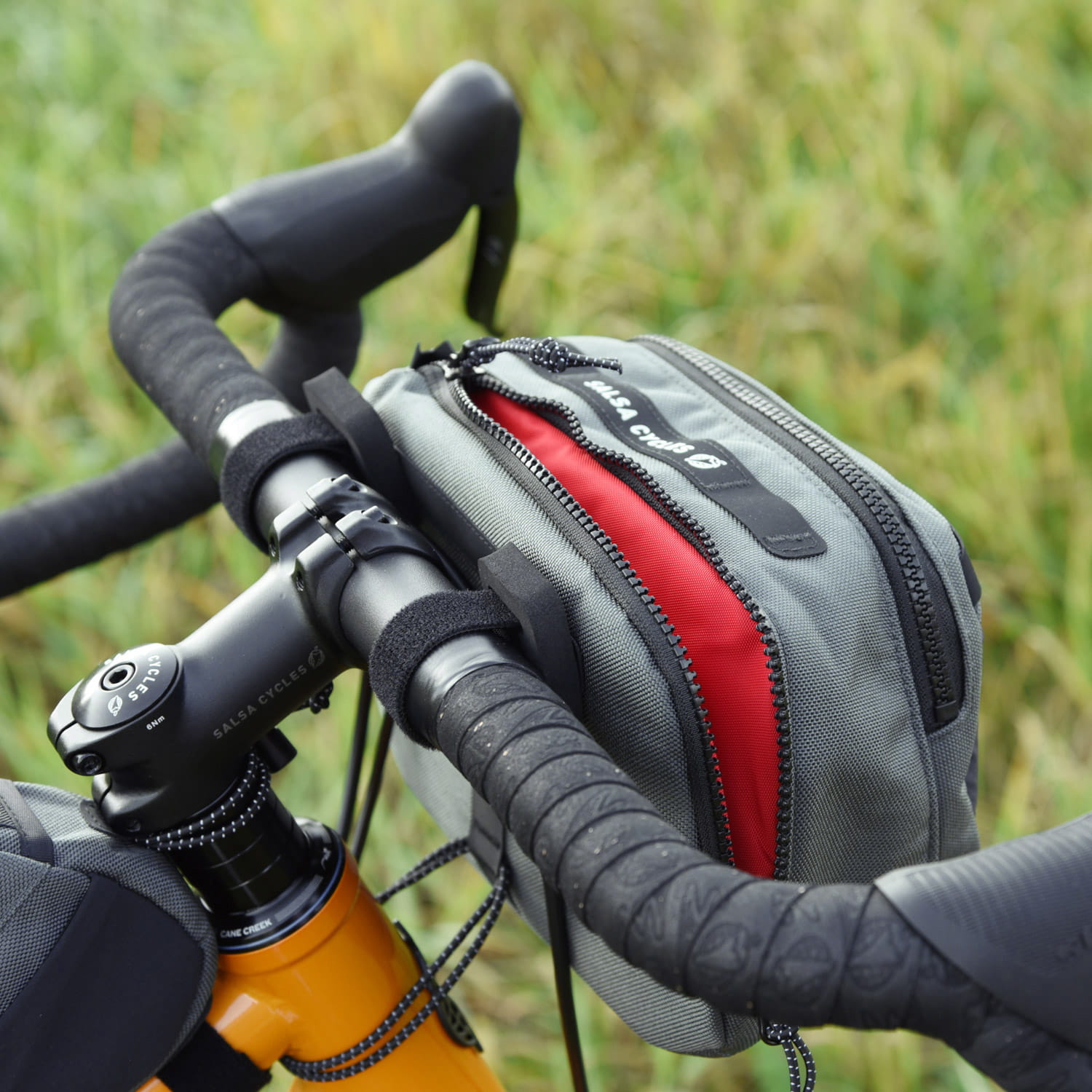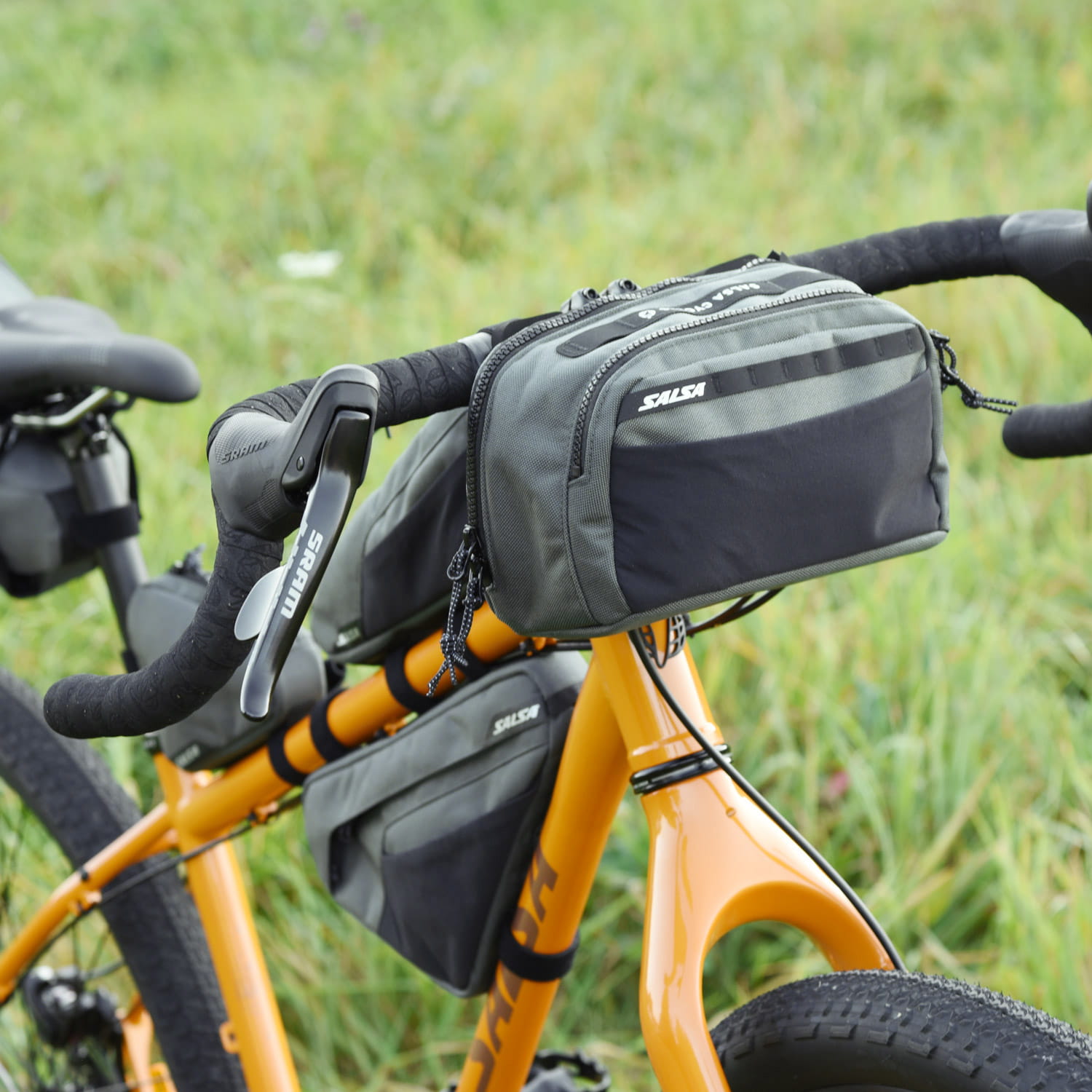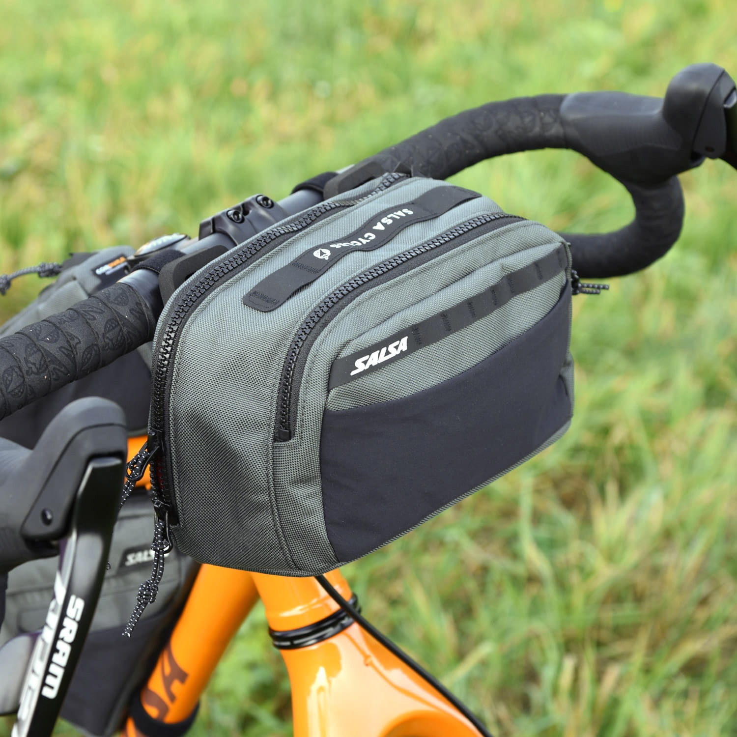 Die Salsa Fireweed Lenkertasche bietet unterwegs Zugriff auf alles Wichtige für die Fahrt, von der Sonnenbrille bis zum dringend benötigten Energiegel bei Kilometer 80.