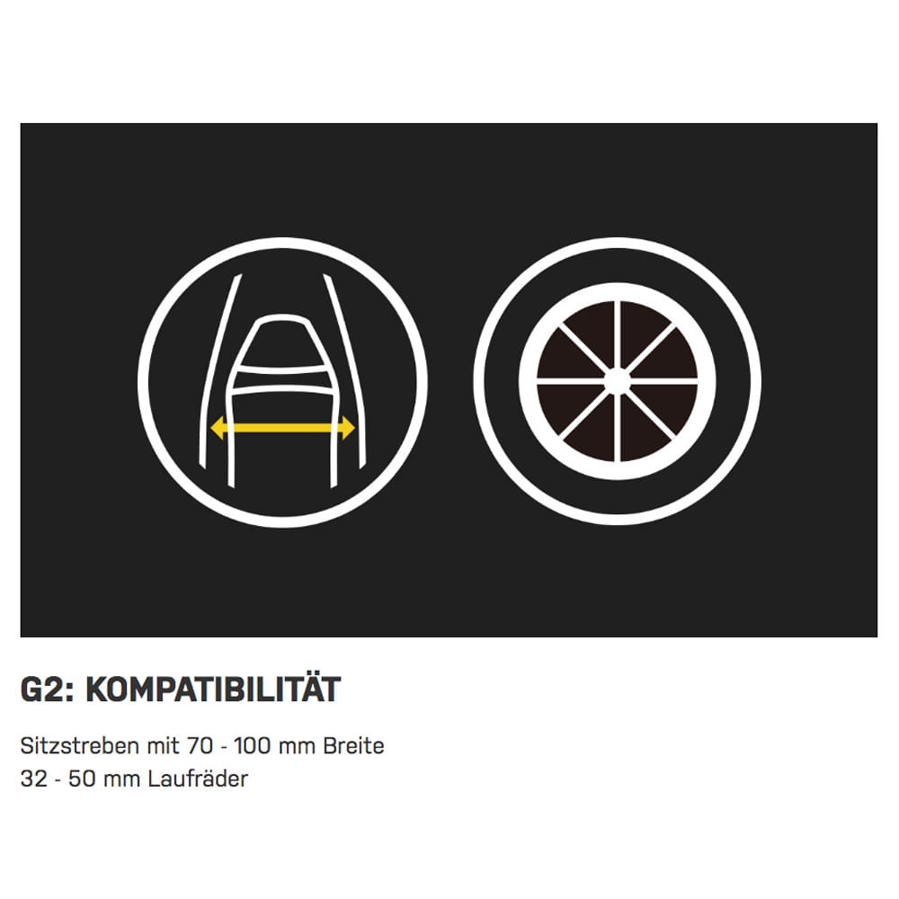 - Sitzstrebenbreite: 70 - 100 mm (gemessen von Mitte zu Mitte)