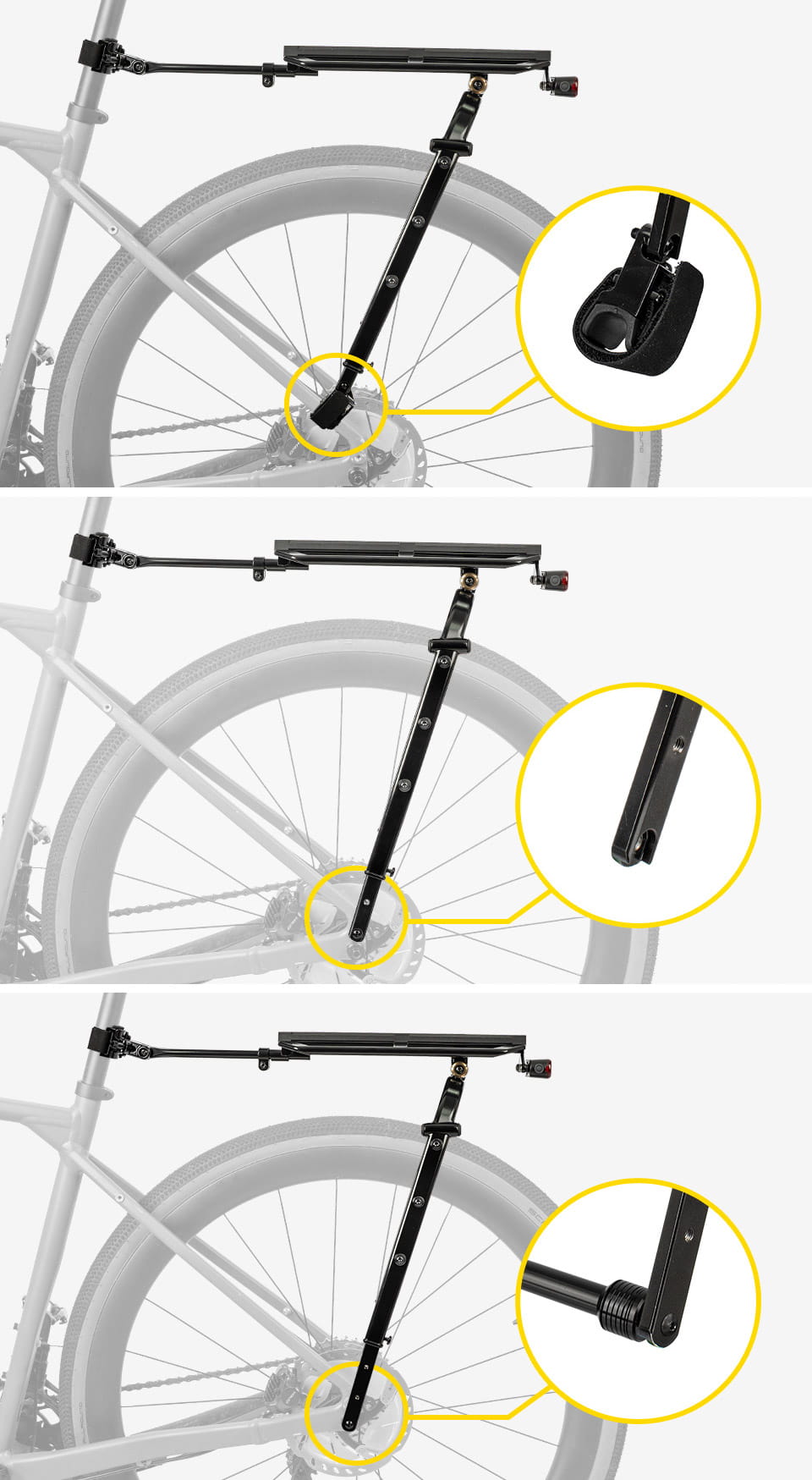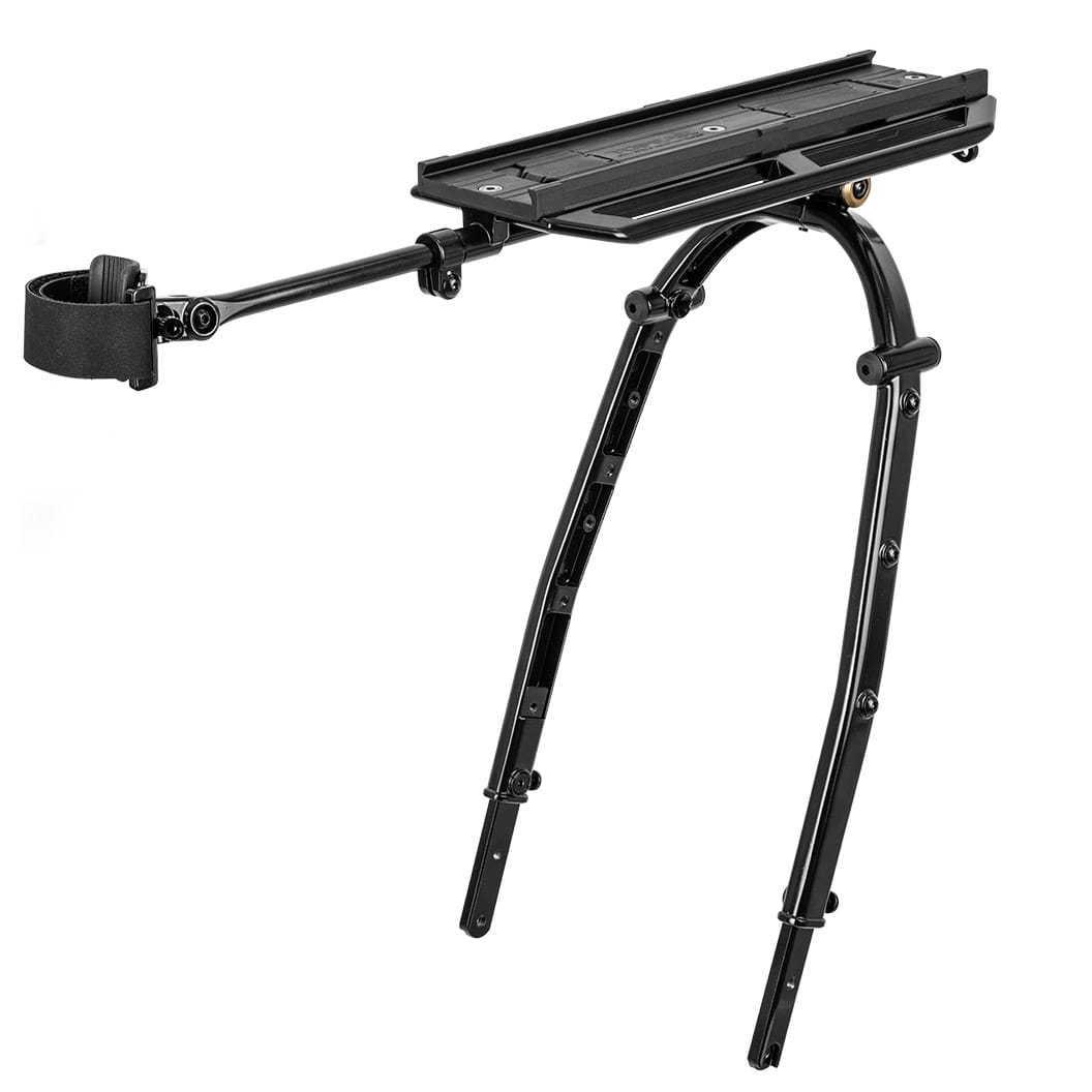 Der Träger kann an Ösen, Sitzstreben oder optional per Thru-Axle befestigt werden. Höhenverstellbare Beine ermöglichen die perfekte Anpassung an verschiedene Rahmenformen. Zusätzliche Montagepunkte erlauben die Befestigung von Flaschenhaltern, Cargo Cages oder Fork Bags.