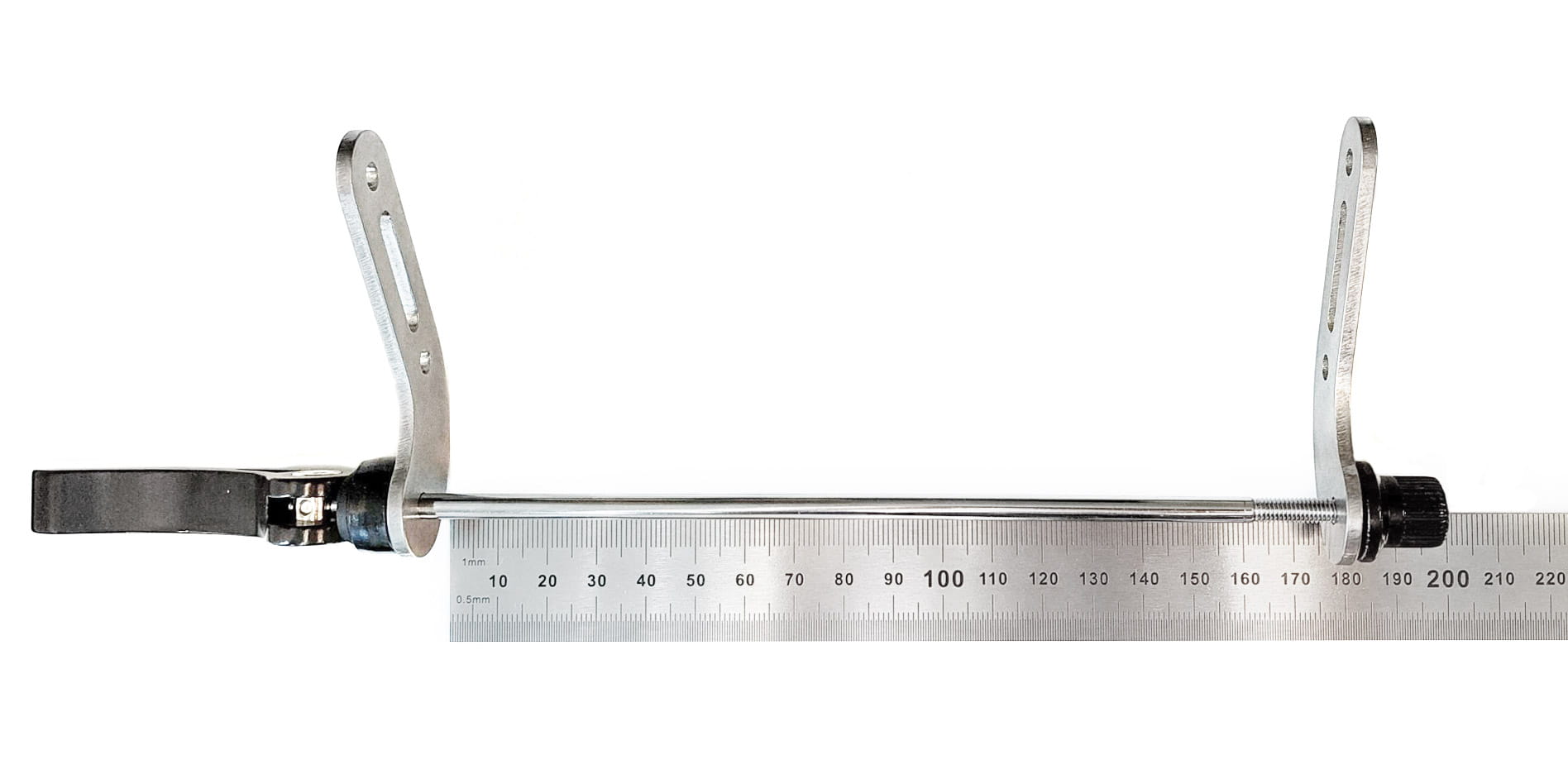 Schnellspannachse mit Adapterblechen und Befestigungsmaterial für den Anbau des Hinterrad-Trägers an Rahmen ohne Gewindeösen.