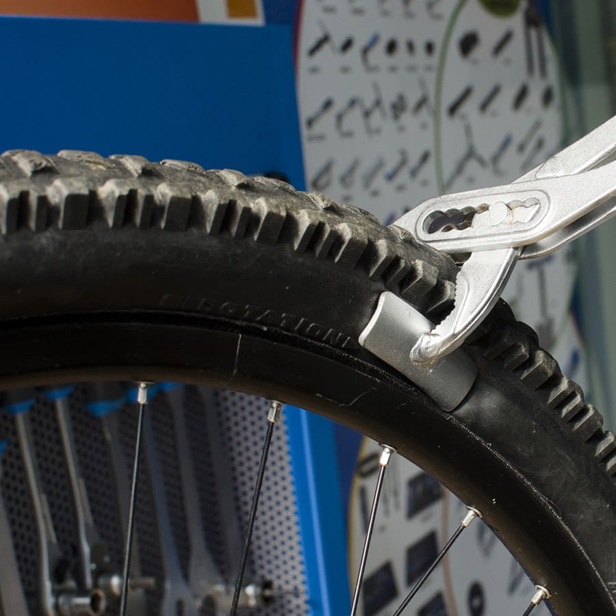 Die Zange ist zur schnellen und einfachen Reifenabnahme – insbesondere derjenigen, die bereits an der Felge haften – bestimmt. Mit der Zange wird der Reifen zusammengedrückt, damit er sich vom Felgenrand löst. Mit einem derartigen Griff vereinfacht man sich deren Abnahme. Die durchdachte Zangenform gewährleistet, dass beim Entfernen des Reifens von der Felge der Luftschlauch nicht beschädigt wird. Die Zange ist verchromt und die Griffe sind für einen angenehmeren Griff kunststoffbeschichtet.