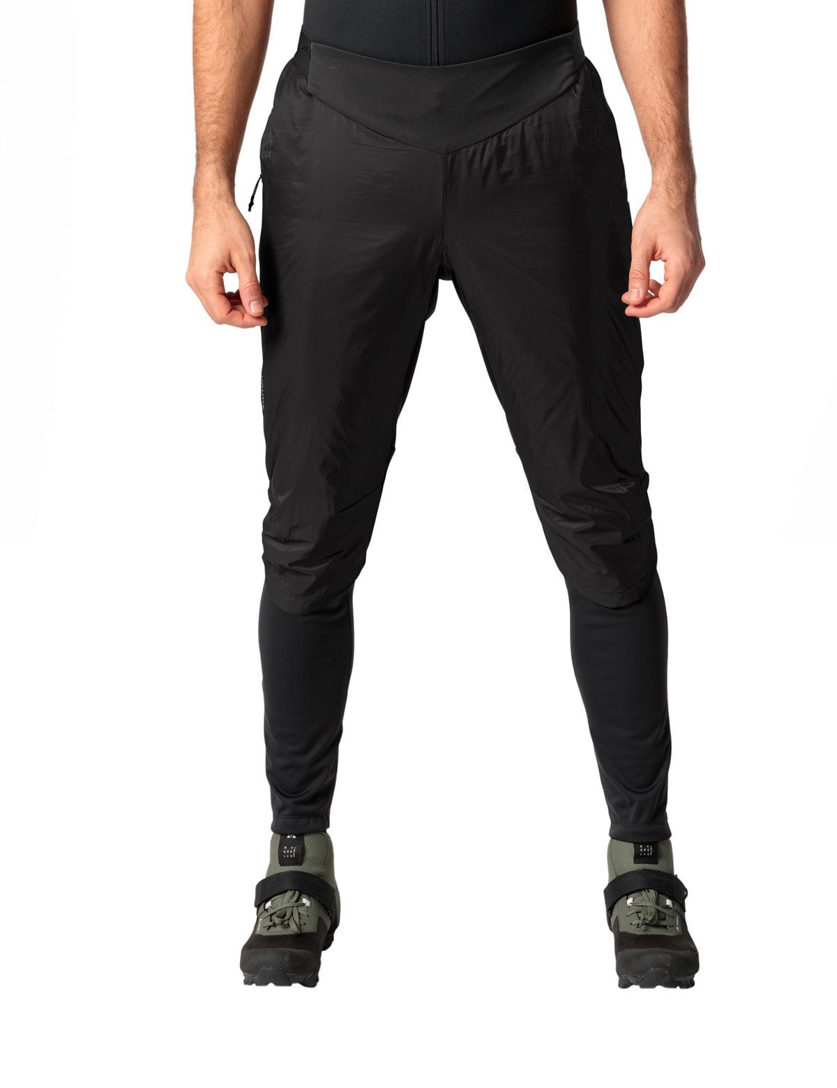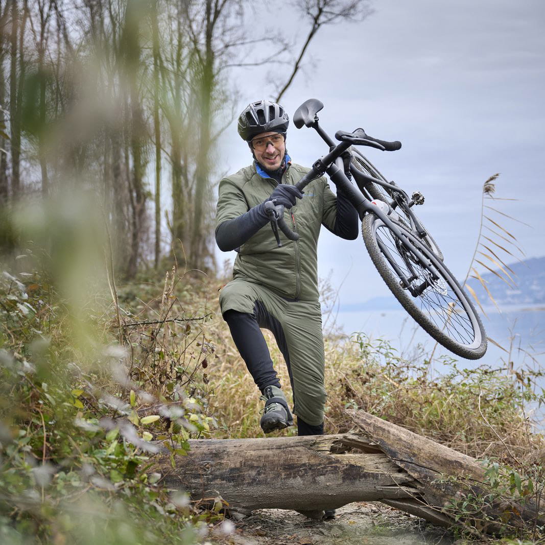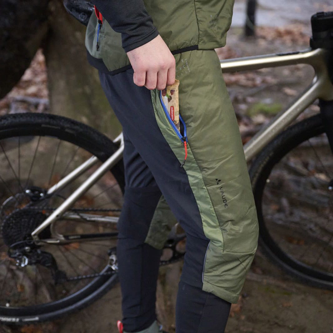 Überzieh-Hose für Herren, die trotz sinkender Temperaturen auf dem Rad trainieren wollen. Die sehr leichten Isolations-Shorts für Herren sind dank das kleinen Packmaßes immer dabei und können ohe zusätzlichen Verschluss über Tights getragen werden. Die hybride Konstruktion der Shorts mit wattierter, atmungsaktiver Front und sehr elastischem, wasser- und schmutzabweisendem 3 Lagen Softshell-Material im hinteren Bereich sorgt für uneingeschränkte Beweglichkeit bei komfortablem Sitz. Der flexible, breitere Bundbereich aus recyceltem Softshellmaterial verhindert unangenehmes Drücken und gibt zusätzlichen Windschutz. Ein elastischer Einsatz mit Silikonprägung im hinteren Bundbereich hält die Herren Isolations-Shorts an Ort und Stelle. Der angenehm längere, im Knie vorgeformte Schnitt hält die Knie beim Pedalieren warm. Der weiche, hintere Beinabschluss wurde nahtlos verarbeitet, um enganliegend Wind und Kälte abzuhalten, ohne zu reiben. Eine kleine Tasche am rechten Bein, die nach hinten unten verläuft, sichert Utensilien, die auf der Fahrt schnell griffbereit sein sollen. Dekorative Reflexelemente im hinteren Bereich runden dieses sehr leichte, wattierte Komfortpaket in dynamischem Schnitt ab.