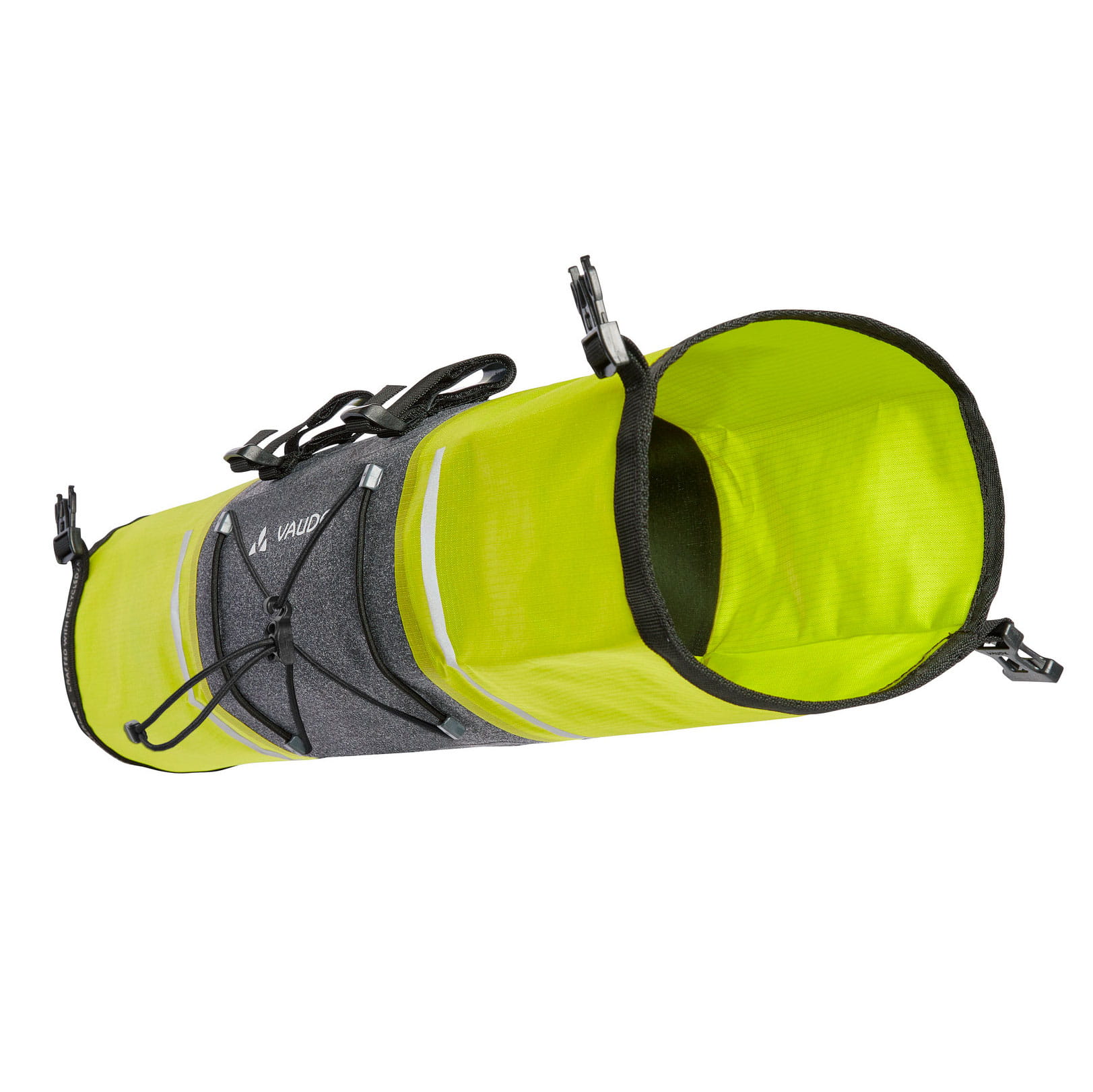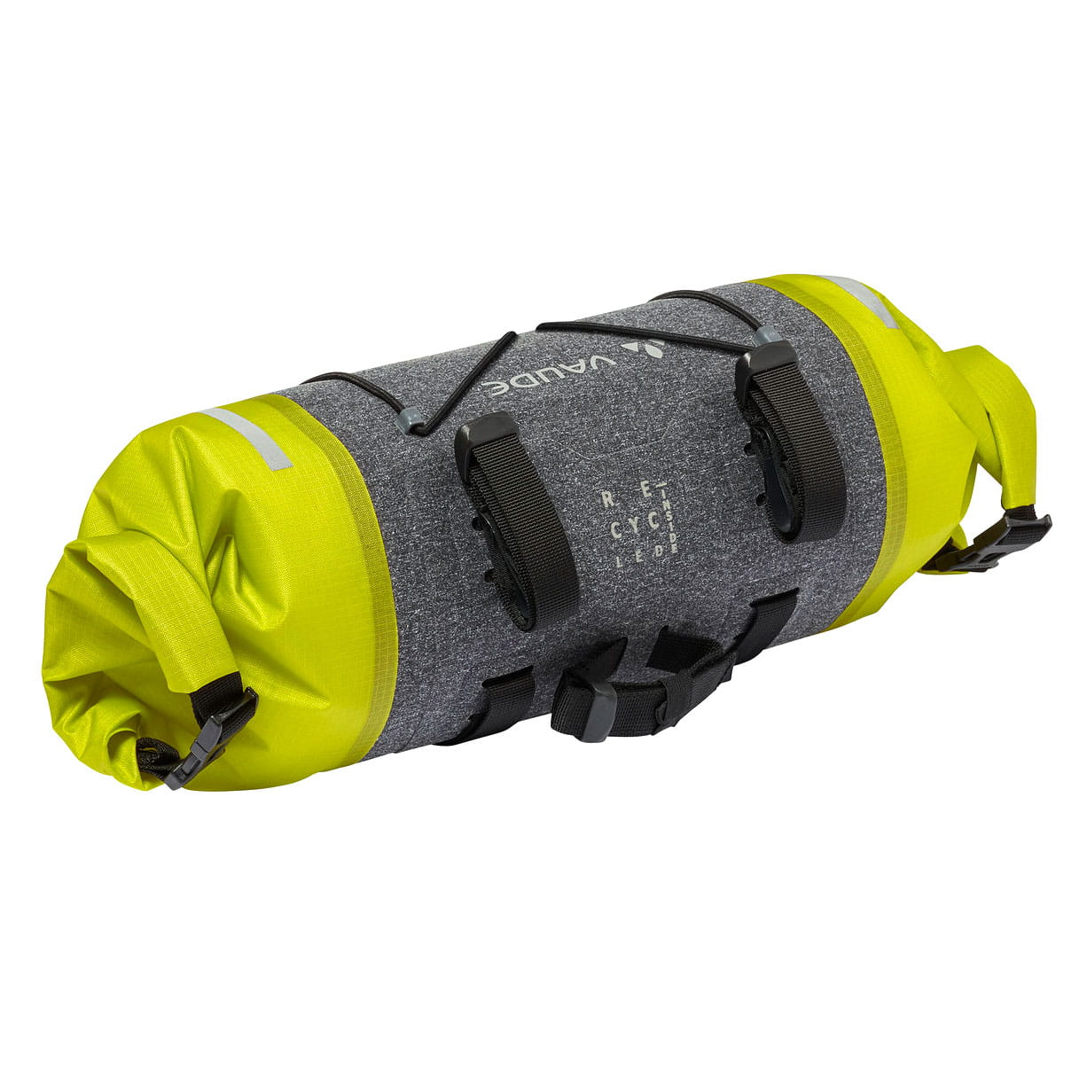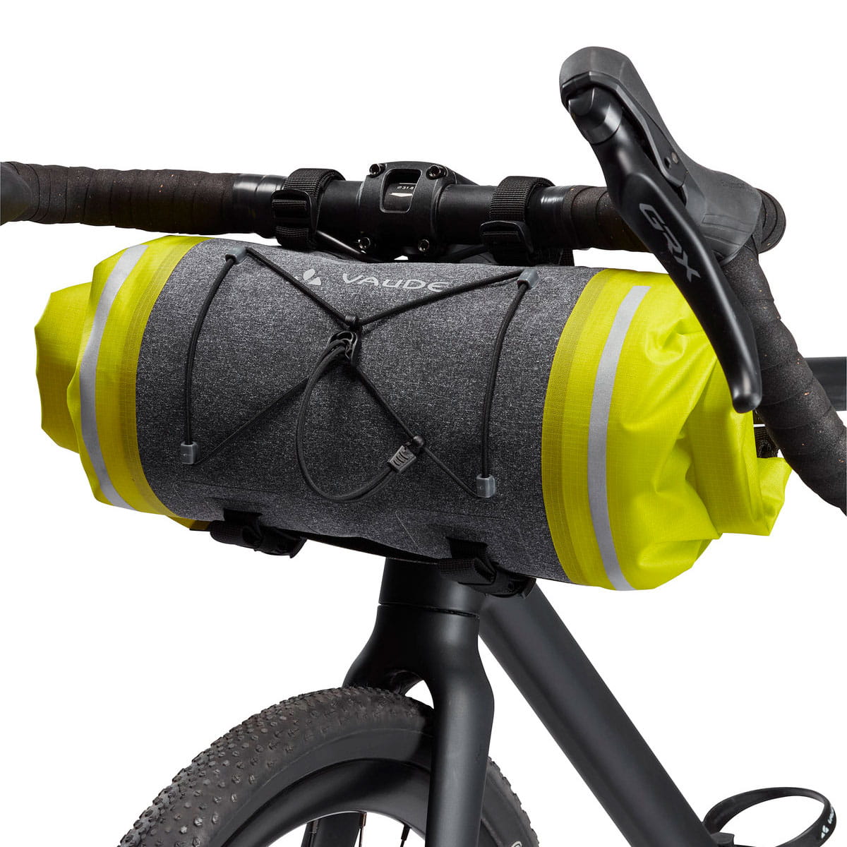 Alles Nötige dabei! In Kombination mit der Bikepacking Satteltasche sorgt die wasserdicht verschweißte Lenkerrolle für ein unbeschwertes Wochenende. Die Lenkerrolle mit 6.2 l Volumen ist von beiden Seiten zugänglich und über Wickelverschlüsse wasserdicht komprimierbar und eignet sich hervorragend für leichtes Gepäck oder einen Schlafsack. Über Packriemen auf der Oberseite kann zusätzliches Gepäck und sogar ein Zelt außen befestigt werden. Die Klettfixierungen machen ein schnelles, dabei sehr stabiles Anbringen am Lenker möglich. Die variabel einstellbare Kordelspinne hält alles fest, was schnell greifbar sein soll. Das Hauptmaterial der Lenkerrolle wird aus recyceltem Polyamid hergestellt, das in einem Upcycling-Prozess aus textilen Materialien, z. B. gebrauchten Fischernetzen, gewonnen wird.