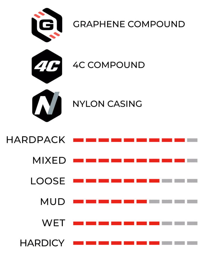 Vittorias hauseigene GRAPHENE 2.0 Gummischung sorgt für Leistungssteigerung in den Bereichen Geschwindigkeit, Haltbarkeit und Durchschlagsfestigkeit. Zudem wird die Bodenhaftung bei Nässe wird deutlich verbessert.
