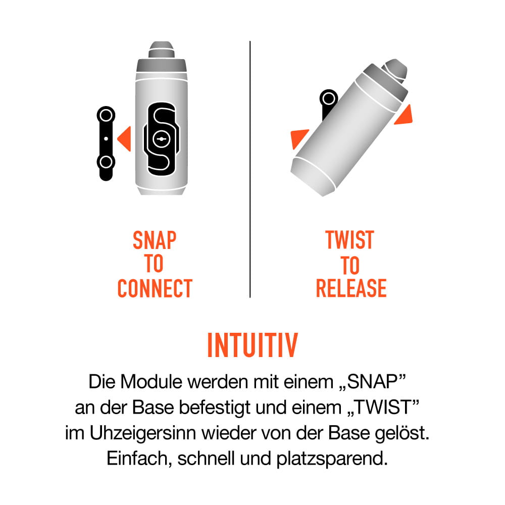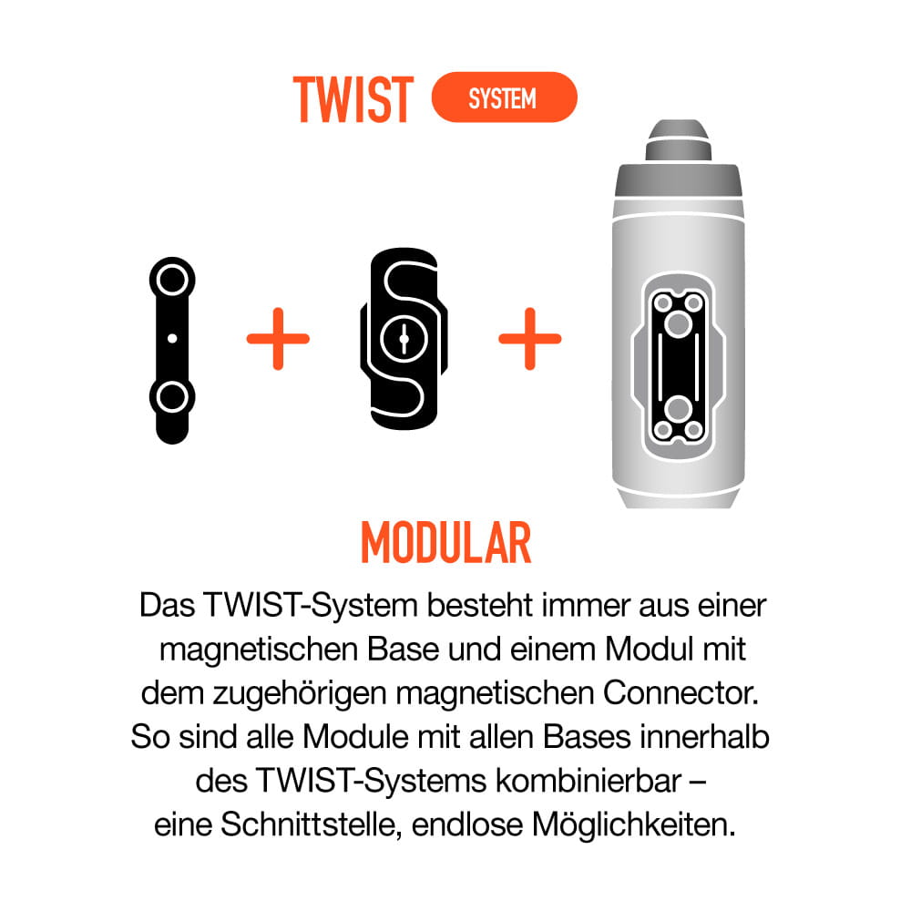 Mit dem magnet-mechanischen Flaschenhaltersystem revolutionierte die Twist bottle 600 die Fahrradflasche. Dabei ermöglicht das nun nochmals verbesserte Overmolding eine ultra sichere Verbindung der Flasche mit dem Fahrrad – ganz ohne Gravity Kit! Mit dem neuen Design der Twist bottle 600 kommt nun nicht nur ein neuer Print. Auch der Deckel ist ab sofort mit den anderen Bottles kompatibel. Und dank des noch weicheren Materials lässt sich die neue TWIST bottle 600 jetzt noch einfacher squeezen.